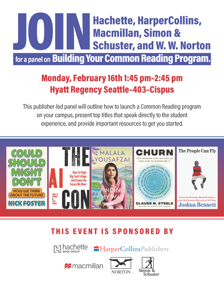 Join us for our “Building Your Common Reading Program” panel! This publisher led panel will outline how to launch a Common Reading program on your campus, present top titles that speak directly to the student experience, and provide important resources to get you started.