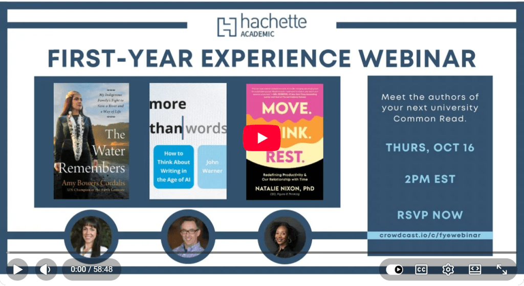 Watch our FYE webinar, where you’ll learn about our program and meet three of our newest authors. Covering topics like the environment, mental health, technology and AI, and more, their books are some of our top picks for your next Common Reads.