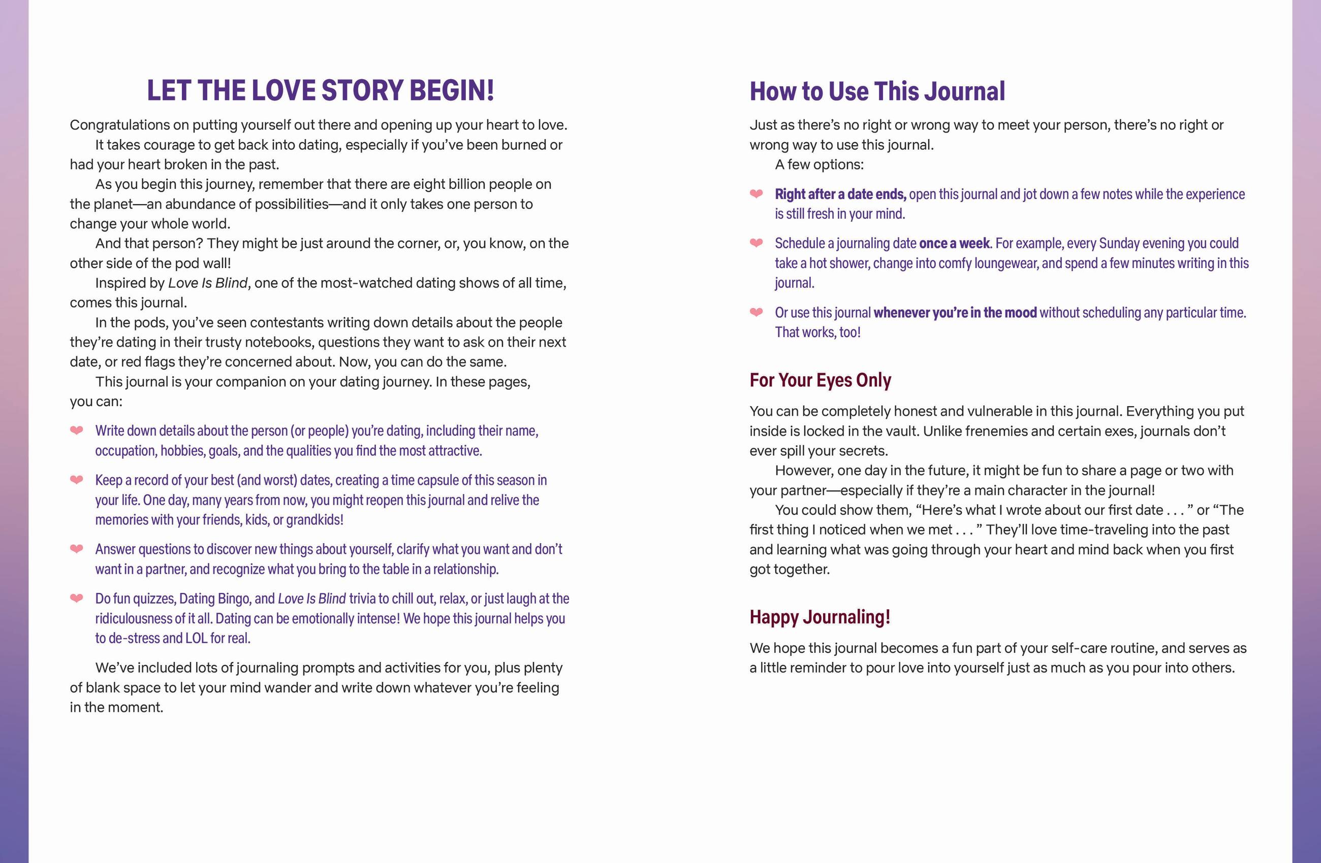 Inspired by the smash-hit Netflix show Love is Blind, this dating journal is the perfect companion to guide readers through the journey to finding their person.