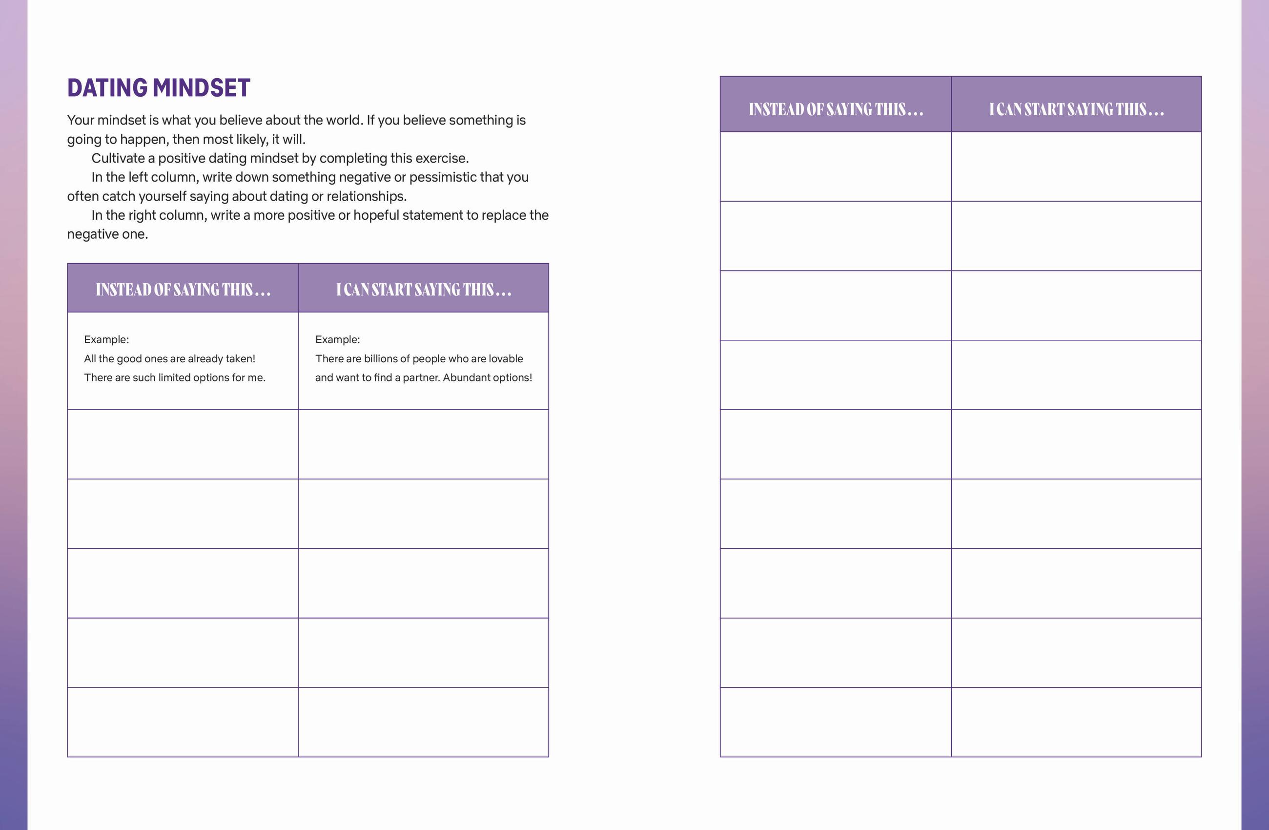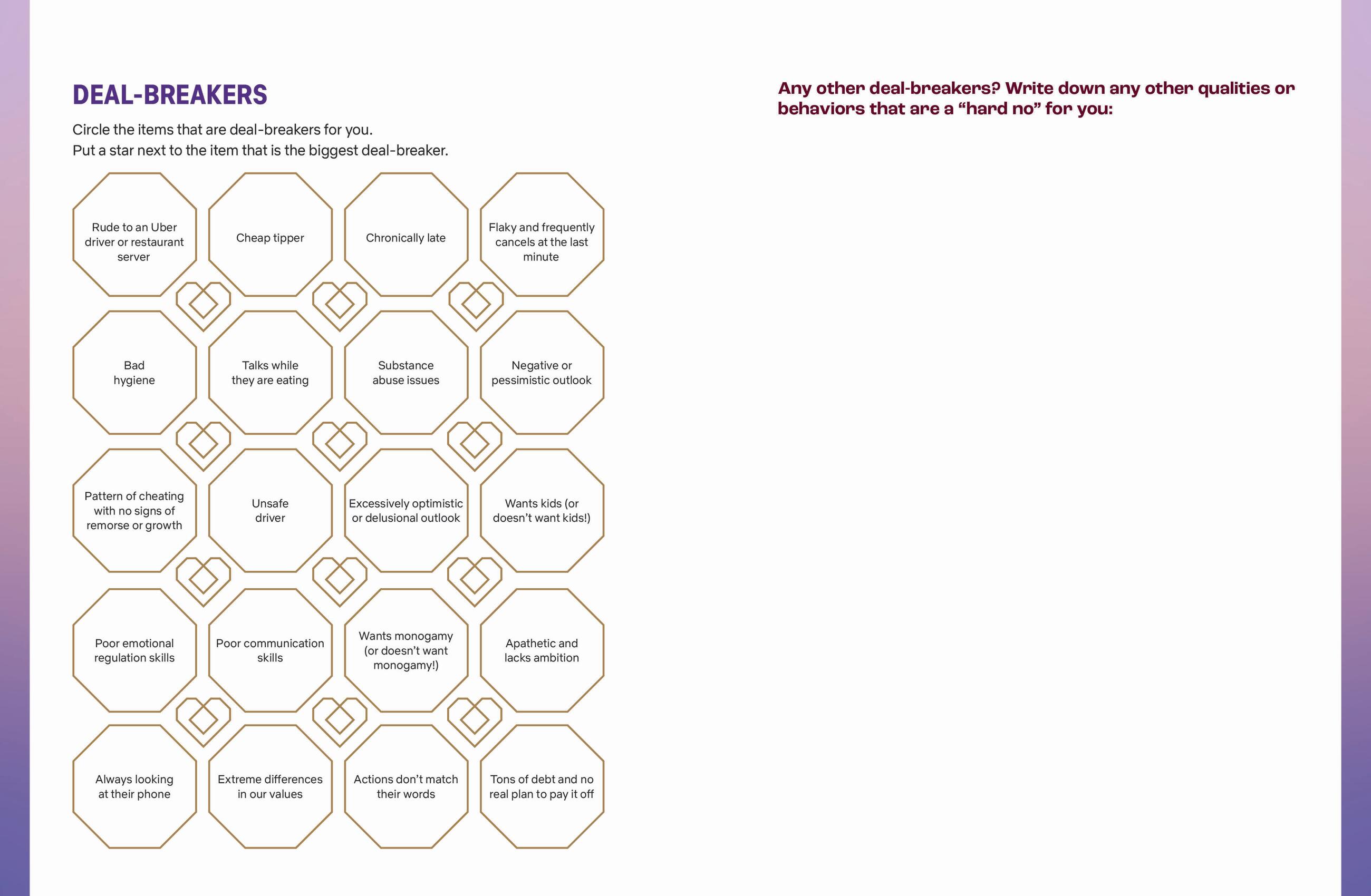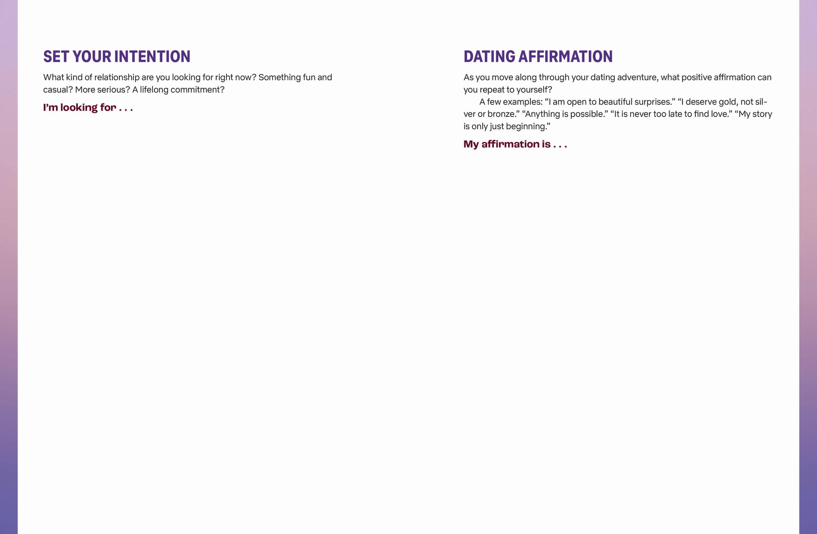 • Answer questions to discover new things about themselves, clarify what they want and don’t want in a partner, and what they bring to the table in a relationship.