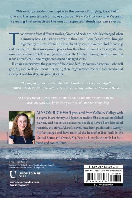 Two women from different worlds, Grace and Anh, are indelibly changed when a runaway boy is found on a street in their small Long Island town. Brought together by the love of this child displaced by war, the women find friendship and healing from their own painful pasts when their lives intersect with a mysterious wounded Vietnam vet. The vet, Jack, works at the Golden Hours, a watch store that mends timepieces—and might even mend damaged souls.