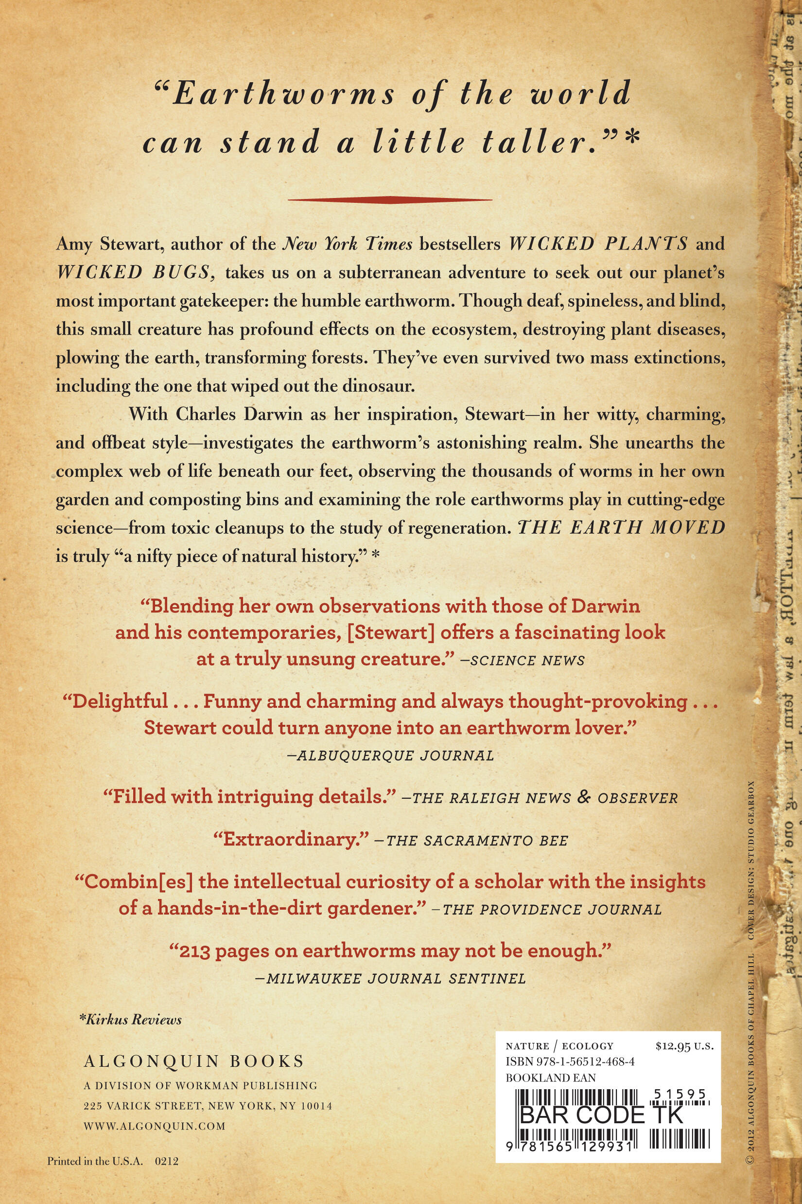 In her witty, offbeat style, Stewart shows that much depends on the actions of the lowly worm. Charles Darwin devoted his last years to the meticulous study of these creatures, praising their remarkable abilities. With the august scientist as her inspiration, Stewart investigates the worm’s subterranean realm, talks to oligochaetologists—the unsung heroes of earthworm science—who have devoted their lives to unearthing the complex life beneath our feet, and observes the thousands of worms in her own garden. From the legendary giant Australian worm that stretches to ten feet in length to the modest nightcrawler that wormed its way into the heart of Darwin’s last book to the energetic red wigglers in Stewart’s compost bin, The Earth Moved gives worms their due and exposes their hidden and extraordinary universe. This book is for all of us who appreciate Mother Nature’s creatures, no matter how humble.