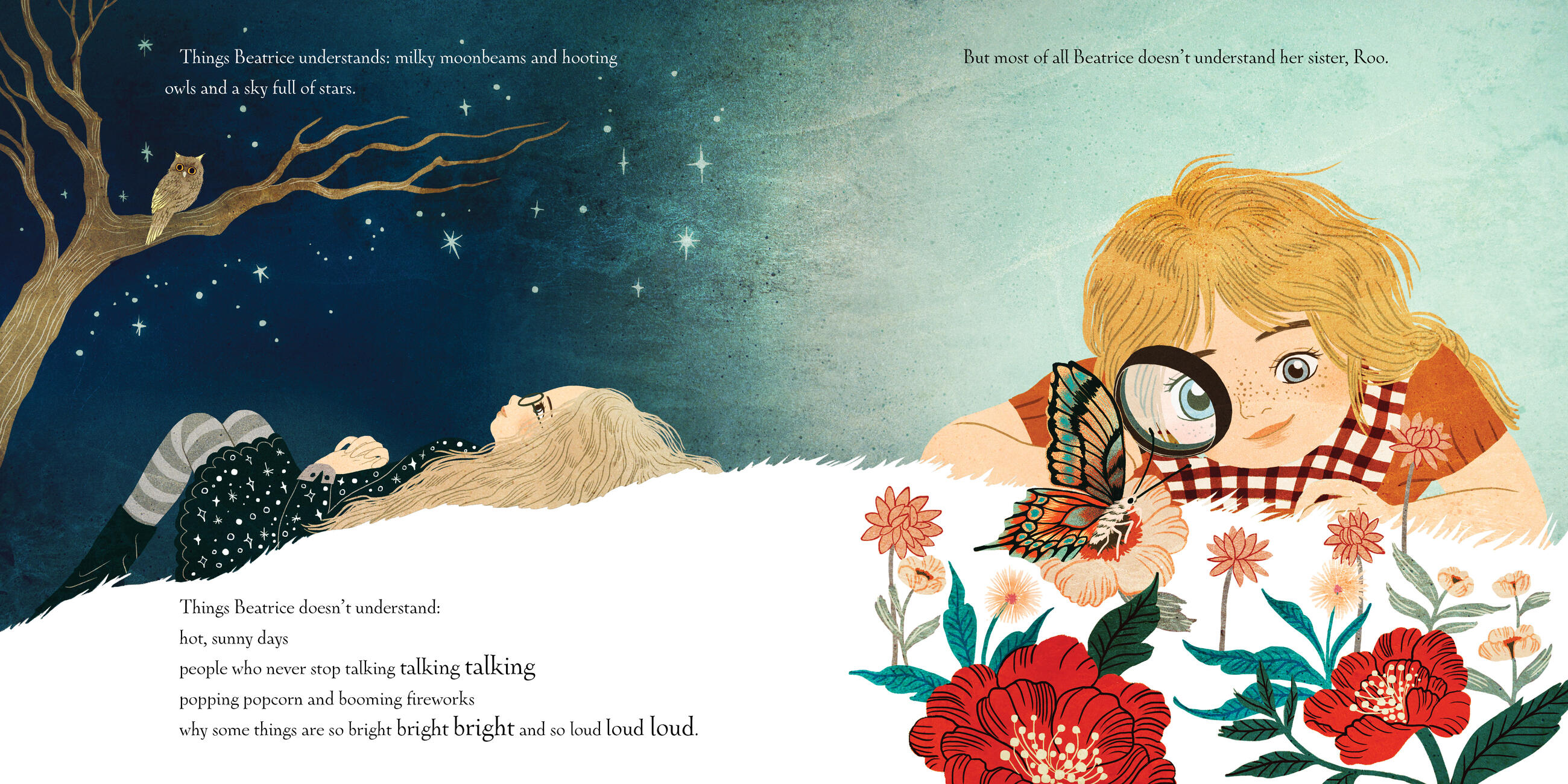 Beatrice likes the dark. She likes black clothes, graveyard picnics, and a sky full of stars. Her sister, Roo, likes the light. She likes bright clothes, picking strawberries, and hot, sunny days. Can Beatrice help Roo love the dark as she does? Can Roo help Beatrice love the light? Or are they simply too different to get along?