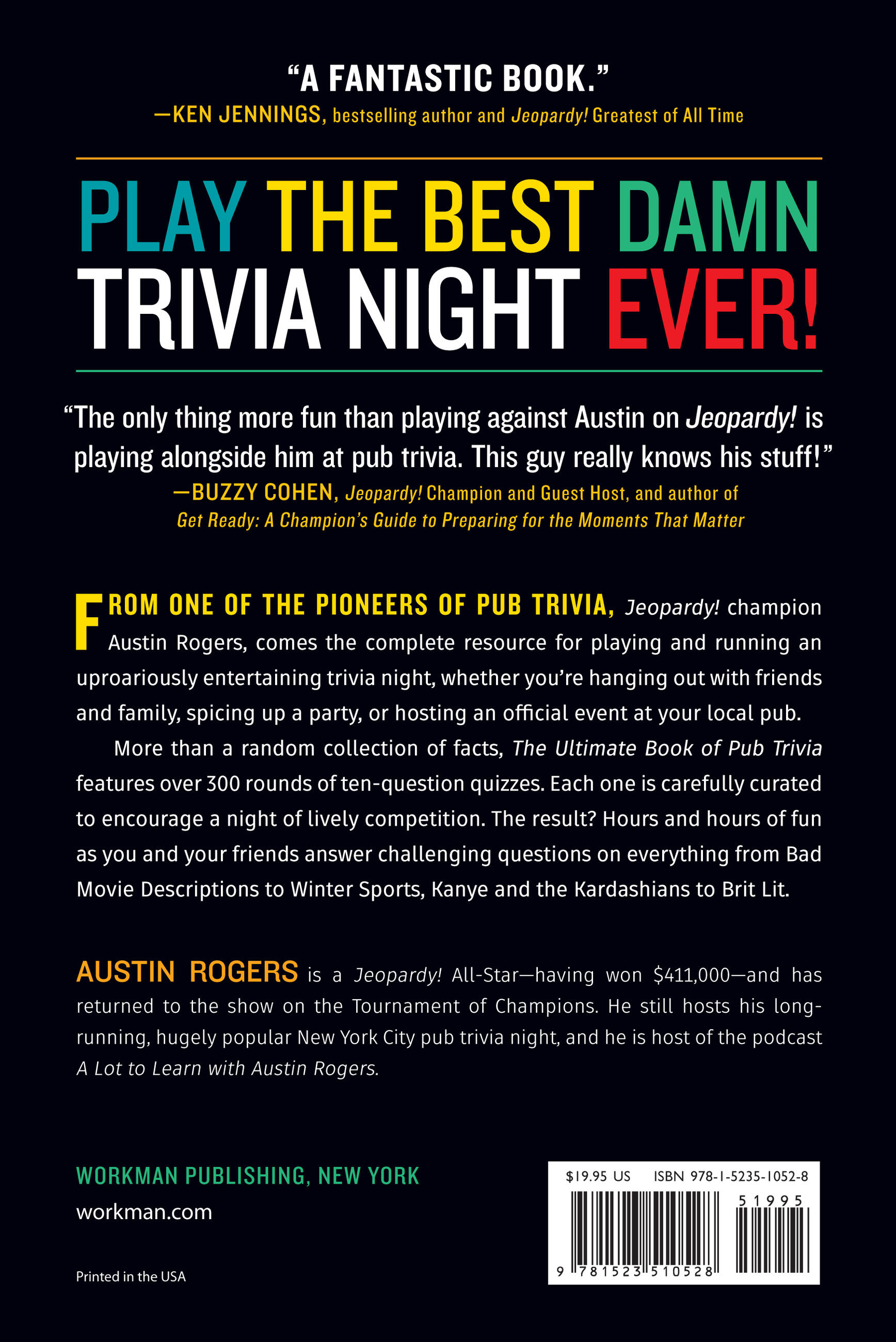 “The only thing more fun than playing against Austin Rogers on Jeopardy! is playing alongside him at pub trivia. This guy really knows his stuff, and this book is a must-have for anyone who is serious about trivia.”