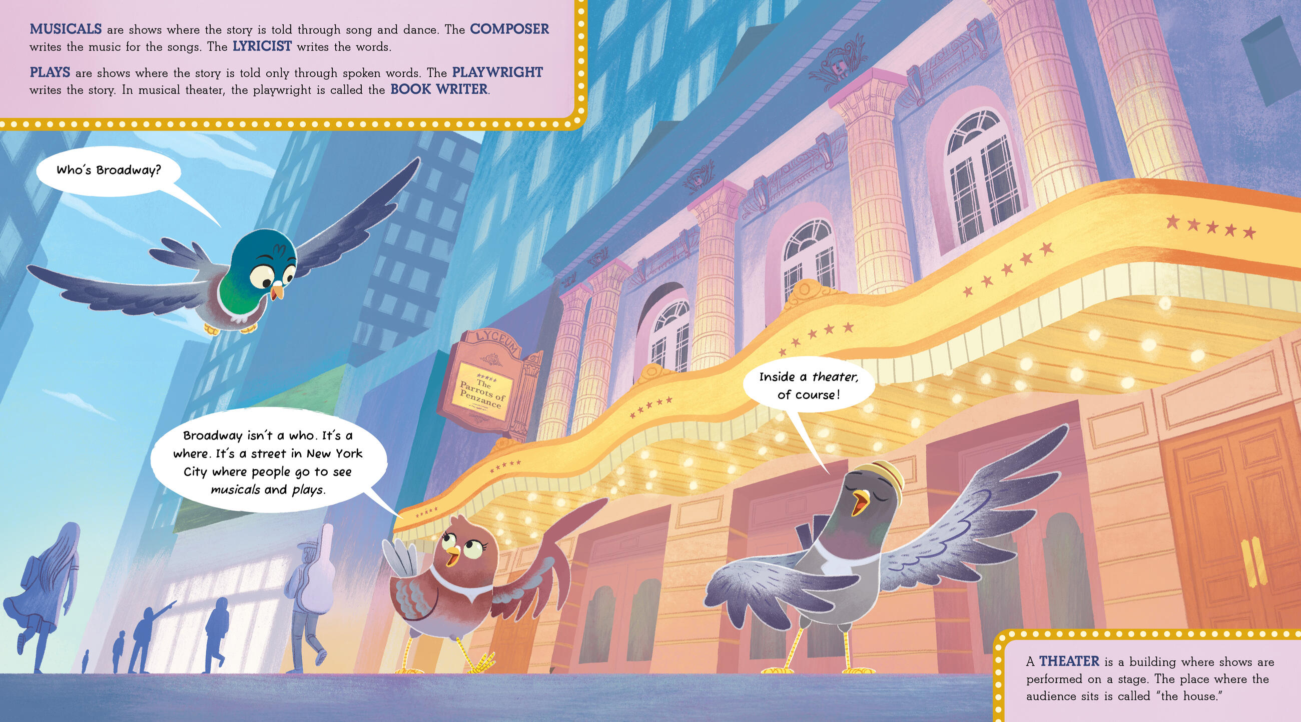 Along the way, you’ll learn about the history of Broadway and all the sensational elements of a Broadway show, from patter songs and ballads to costumes and choreography, with a trio of New York City pigeons as your tour guides. Here’s your ticket. Enjoy the show! (And don’t forget to sing along.)