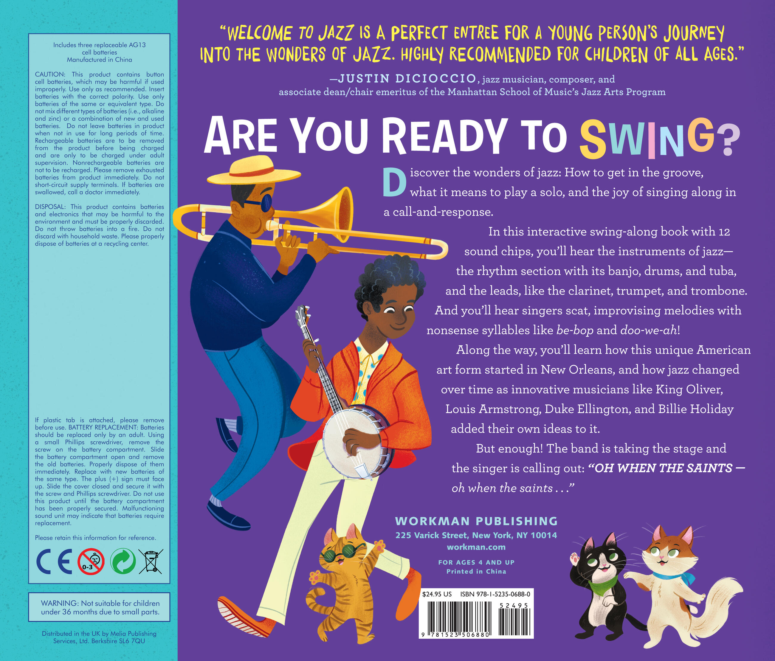 In this interactive picture book with 12 different sounds, you’ll hear the instruments of jazz—the rhythm section with its banjo, drums, and tuba, along with the leads, like the clarinet, trumpet, and trombone. You’ll also hear singers “scat”, improvising melodies with special syllables like “be-bop” and “doo-we-ah”!
