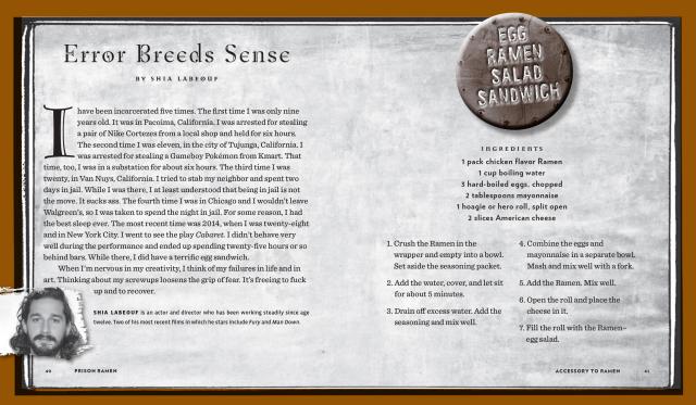When you’re in prison, a little money in the commissary can mean the difference between a life of flavorless misery and the pleasure of re-creating a taste of childhood. And it starts with Ramen. Filled with contributions from anonymous inmates as well as names you’ll recognize, such as guitarist Slash and actors Danny Trejo, Taryn Manning, and Shia LaBeouf, Prison Ramen is an original collection of inspired Ramen hacks: Hit Man Burritos. Sloppy Ramen Joe. Onion Tortilla Ramen Soup. Shawshank Spread. And Orange Porkies: Chile ramen + white rice + 1 bag pork skins + orange-flavored punch.