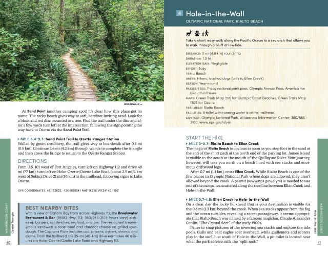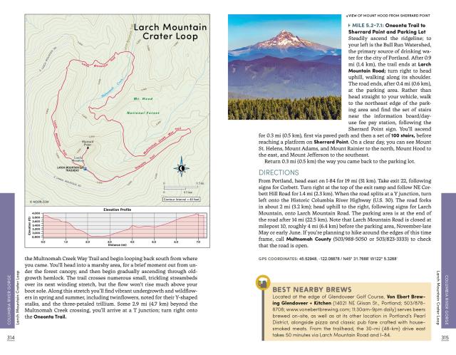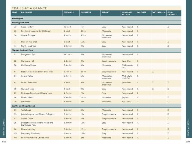 - Essential Planning Details: Each hike is described in detail and marked with round-trip distance and hiking time, difficulty, terrain type, elevation gain, and access points