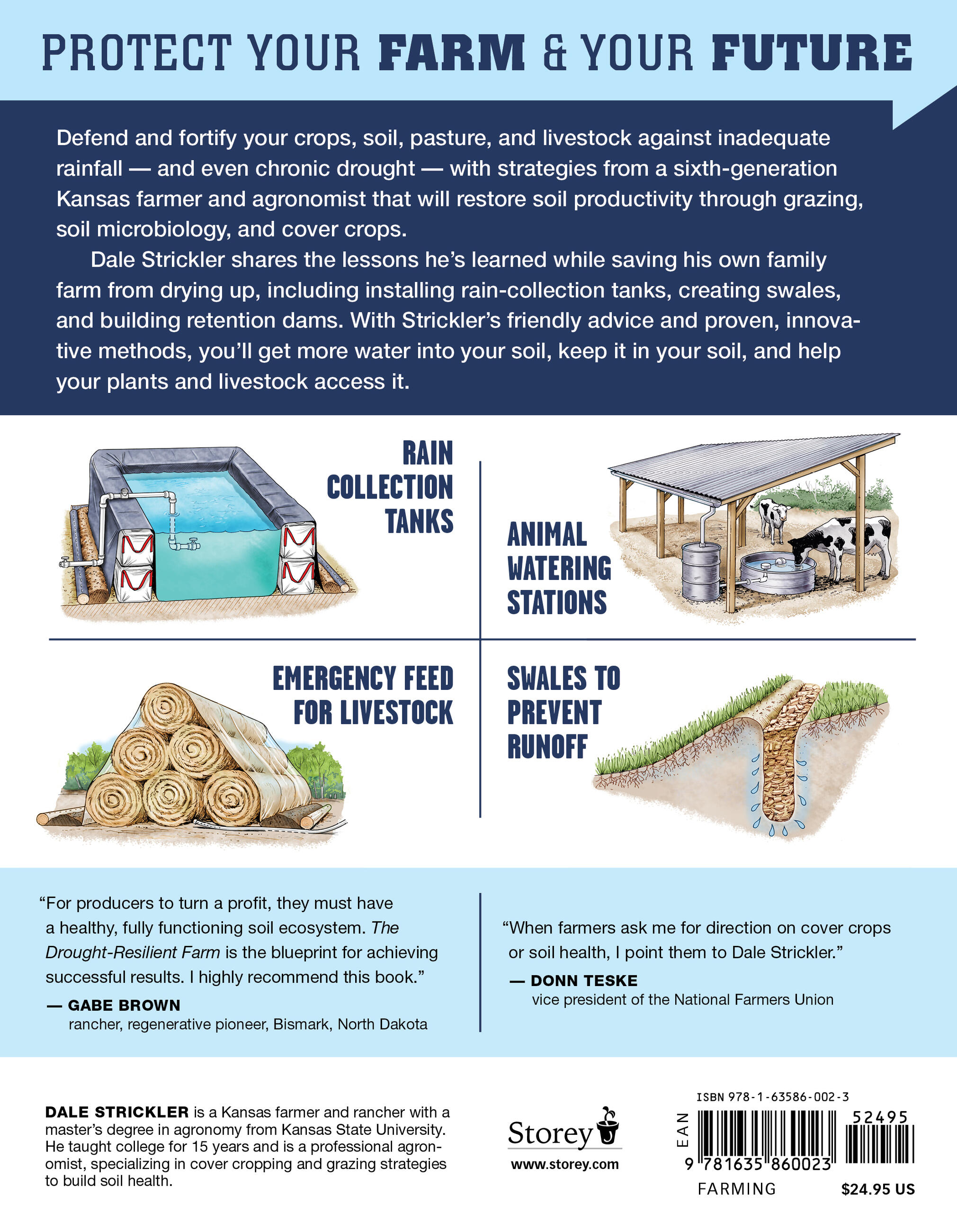 Rainfall levels are rarely optimal, but there are hundreds of things you can do to efficiently conserve and use the water you do have and to reduce the impact of drought on your soil, crops, livestock, and farm or ranch ecosystem. Author Dale Strickler introduces you to the same innovative systems he used to transform his own drought-stricken family farm in Kansas into a thriving, water-wise, and profitable enterprise, maximizing healthy cropland, pasture, and water supply. Ranging from simple, short-term projects such as installing rain-collection ollas to long-term land-management planning strategies, Strickler’s methods show how to get more water into the soil, keep it in the soil, and help plants and livestock access it.