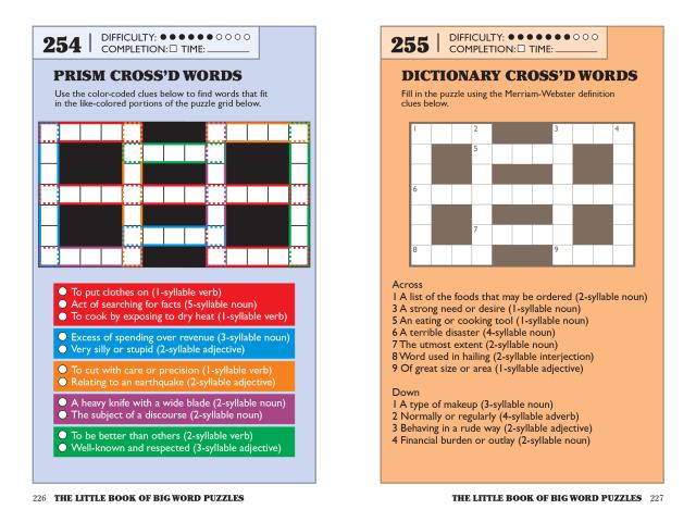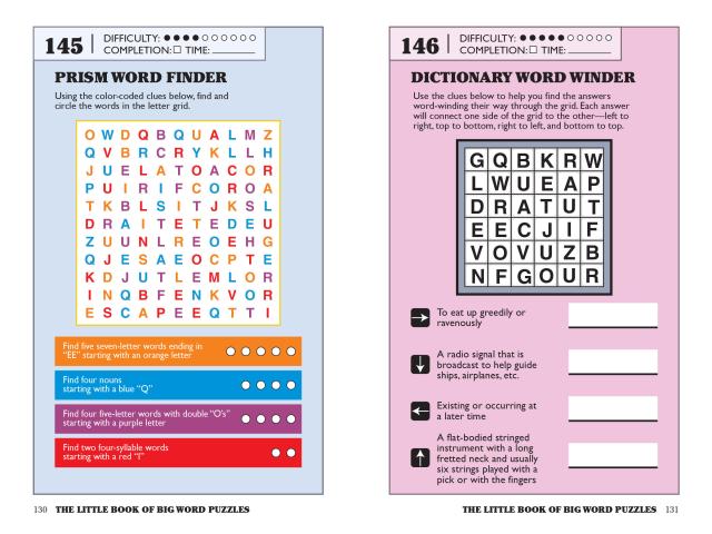 In Mixed-Up Definition, unscramble the letters to reveal the definition of a given word. In Syllabary, use the clues to link syllables in a grid to create words. In Cross’d Word Connections, find the letters in common to help solve a series of four crossword puzzles. Plus Dictionary Race Winder, Make the Connection, Color Word Chains, Prism Word Finder, and other clever riffs on word searches.