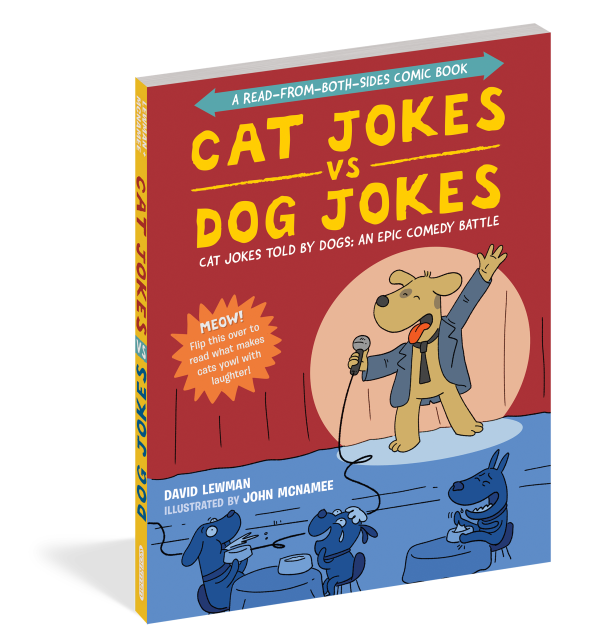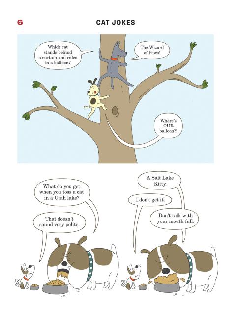 Presented in a read-from-both-sides format, the first half of the book consists of cat jokes told by a recurring cast of dogs (What do you call an insect in a cat’s bathroom? A litterbug!). Flip the book over to start from the other side, and it becomes a book of dog jokes told by cats (What’s the difference between kibble and a heavy mist? One is dog food, and the other is fog, dude!) In the middle spread, the casts of cartoon dogs and cats come together for a mid-book finale of shared giggles, snorts, and guffaws.