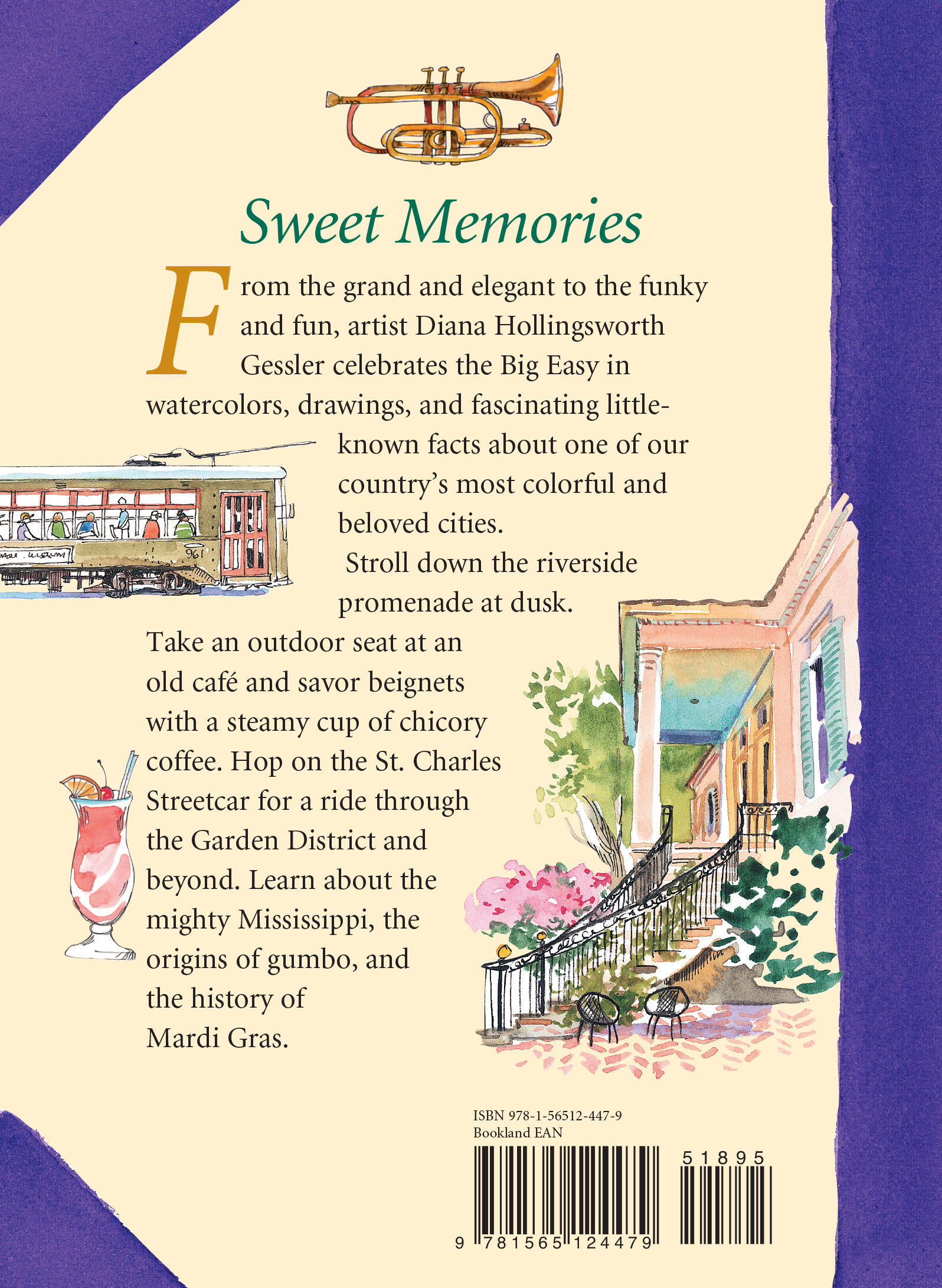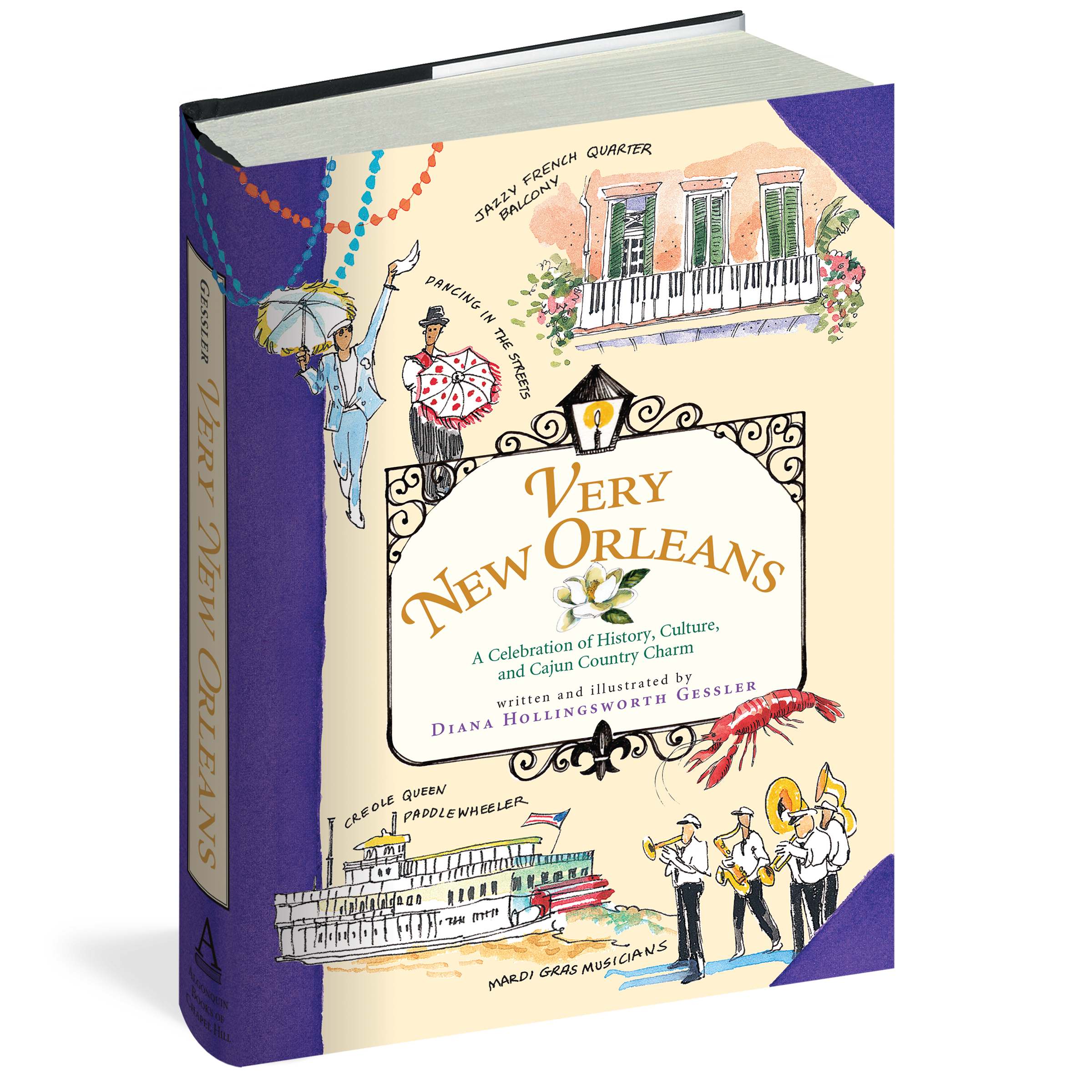 In vibrant watercolors and detailed sketches, artist Diana Gessler captures the unique charm that makes New Orleans alluring: Mardi Gras, the Cabildo, Jackson Square, the Court of the Two Sisters, St. Louis Cemetery, the Jazz Festival, the River Road Plantations, the Cajun country, sumptuous Creole cuisine, and Audubon’s Aquarium of the Americas. In fascinating detail—on everything from the making of Mardi Gras, Napolean’s death mask, the city’s inspired architectural and garden designs, and favorite author hangouts to famous New Orleanians and Aunt Sally’s Creole pralines—Very New Orleans celebrates the city, the Cajun country, the people, and our history