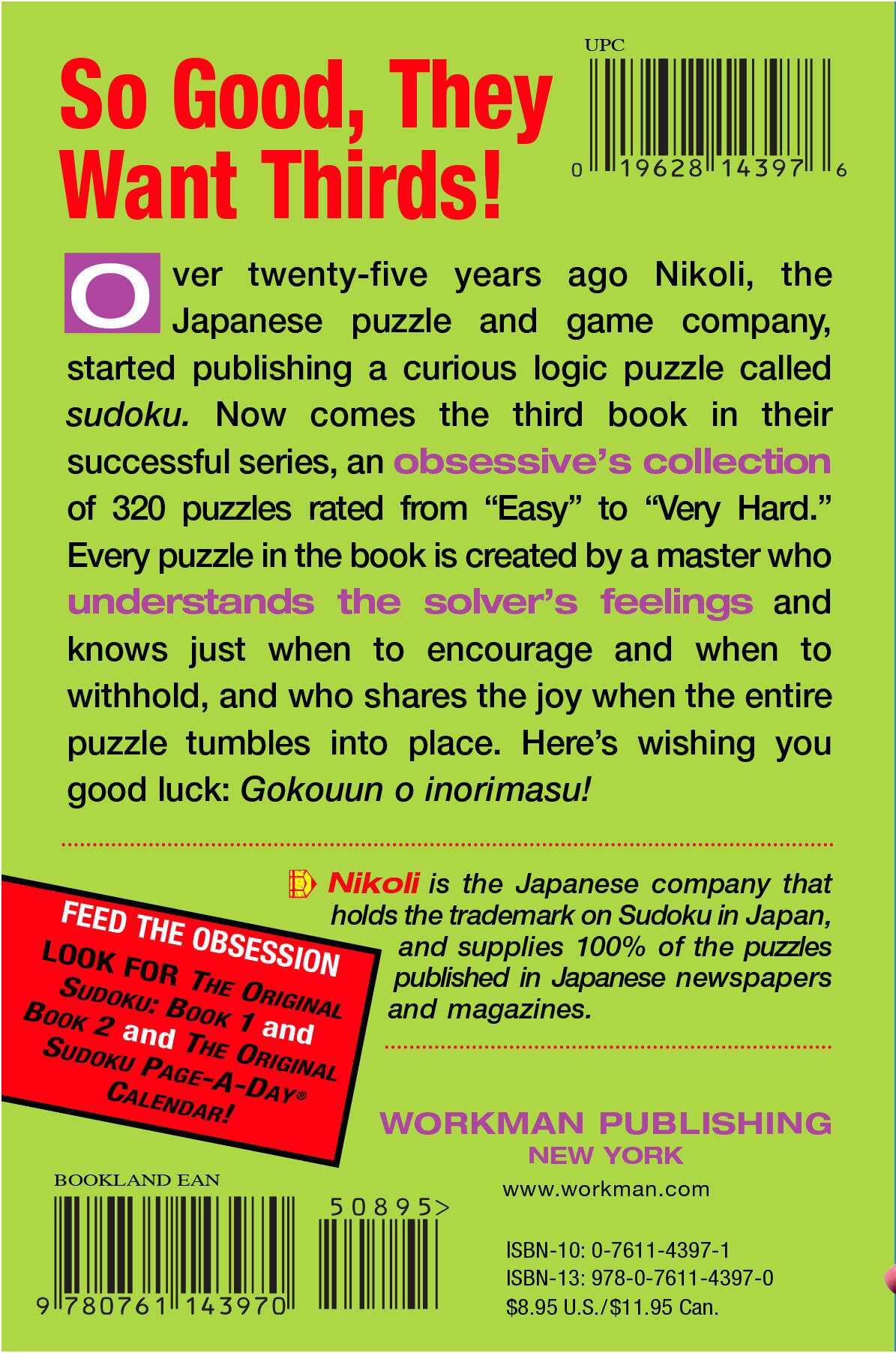 Over twenty years ago Nikoli, the Japanese puzzle and game company, started publishing a curious logic puzzle called Sudoku. The rest of the world recently joined the Sudoku craze by using computer programs to create puzzles, but Nikoli is the only company that still crafts their puzzles the old-fashioned way: by hand. As Ad Age wrote in a profile, the Nikoli credo is “The Best Puzzles Are Made by Happy Employees.” And for solvers, it really does make a difference—there’s an elegance and symmetry to the puzzles, plus a sense of interaction. The puzzle-maker knows just when to encourage, and when to withhold. Puzzles marked “Easy,” are easy because the puzzler leads you through. Those marked “Very Hard” are exactly that—they pit your mind against the mind of the master, who seems to share the joy of that moment when one hard-won number is captured, and the entire puzzle tumbles into place.