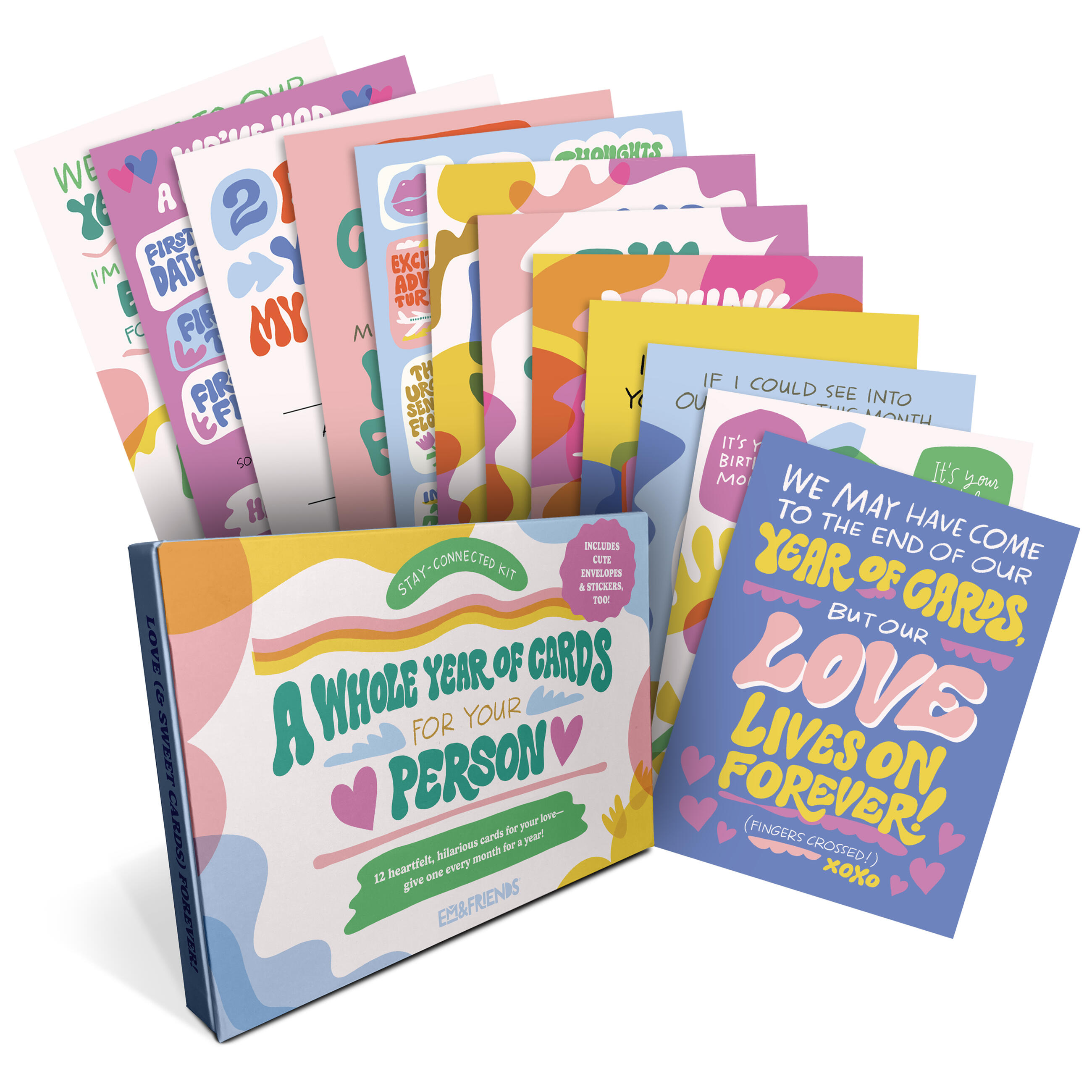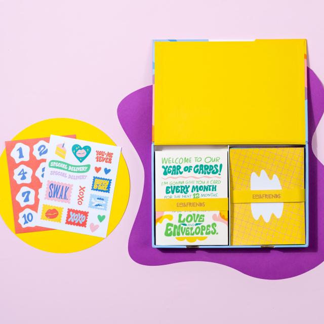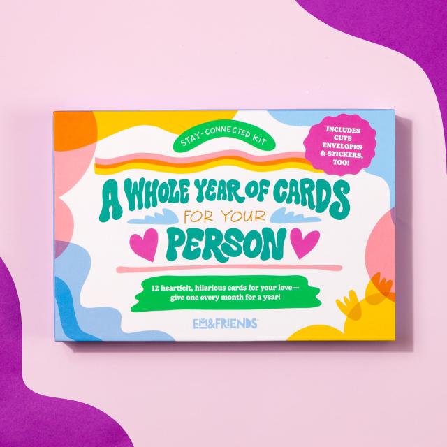 Finding ways to surprise and delight Your Person can be a challenge. Let us take care of it for you! Our new greeting cards boxed set supplies one card a month from you to your special boo (are people still saying boo?), including a birthday card!. Cute stickers make sealing the deal even sweeter. You can start sending the cards at any time.