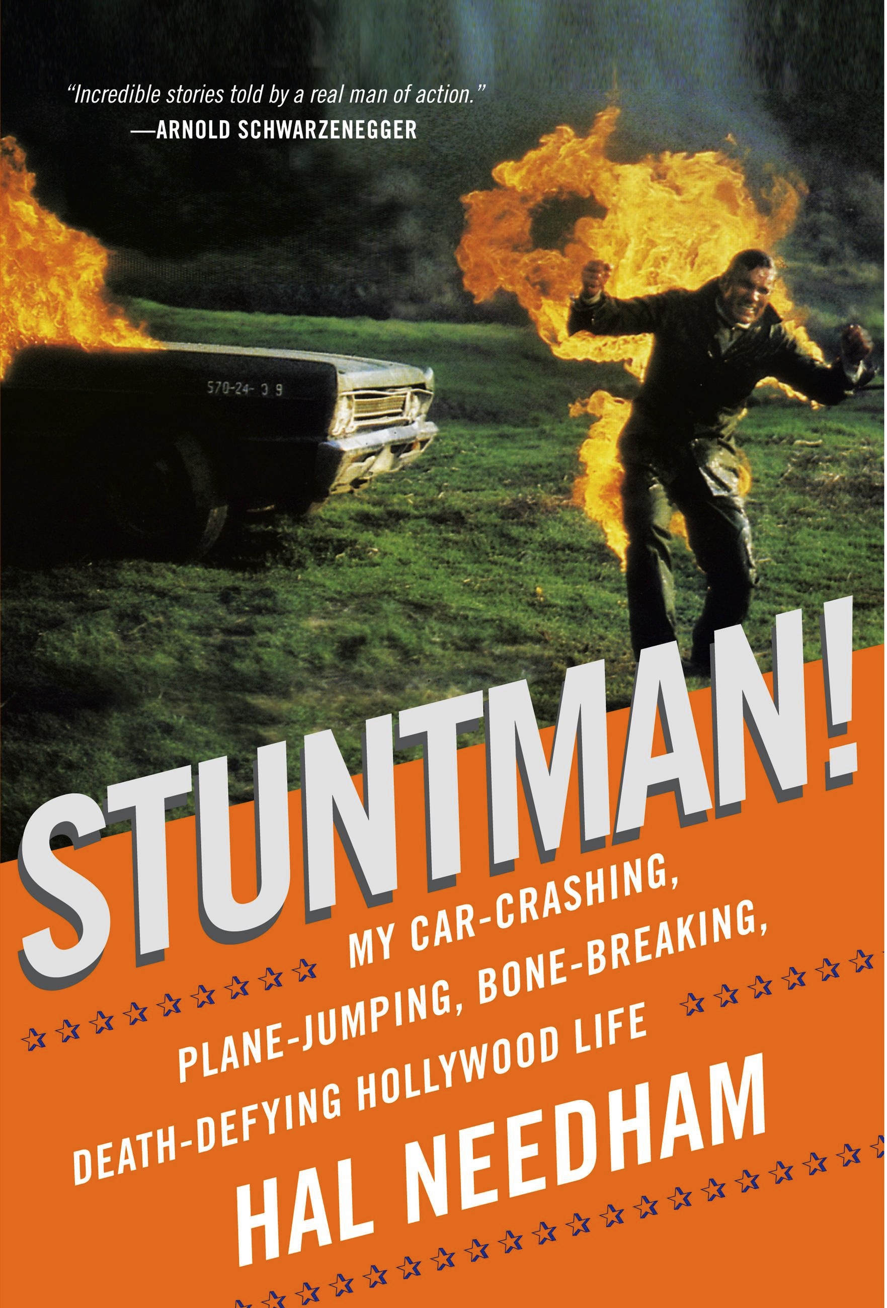 Yep that’s me, Hal Needham, on the cover doing a fire stunt. When you’re on fire you don’t dare breathe because if you do, you’ll suck those flames right down your throat. I was Hollywood’s highest paid stuntman so I should know.
