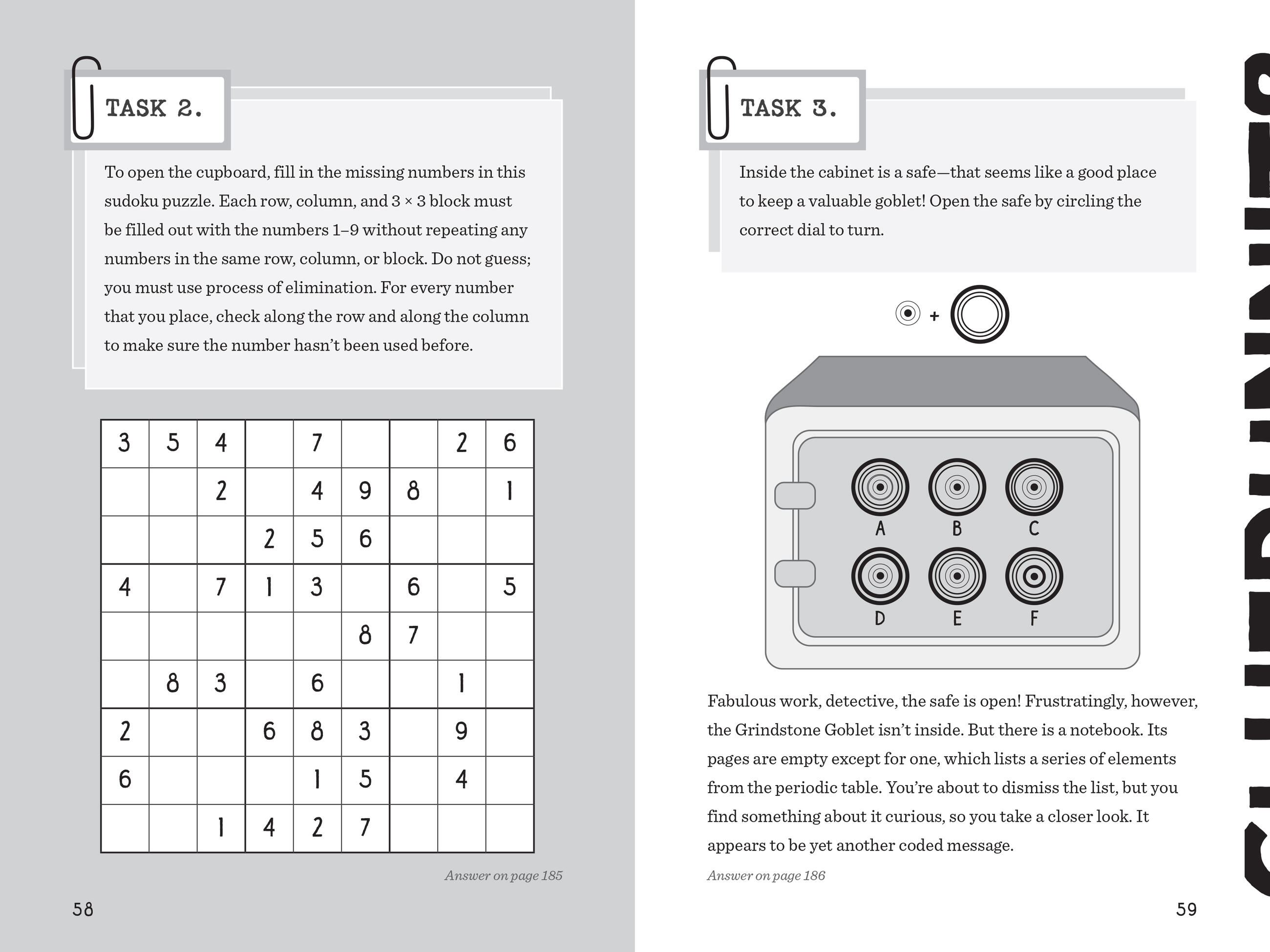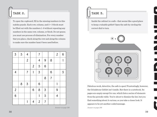 Packed full of codes to crack, evidence to evaluate, clues to unravel, and maps to navigate, Cluedle: The Case of the Grindstone Goblet is chockful of puzzling fun!
