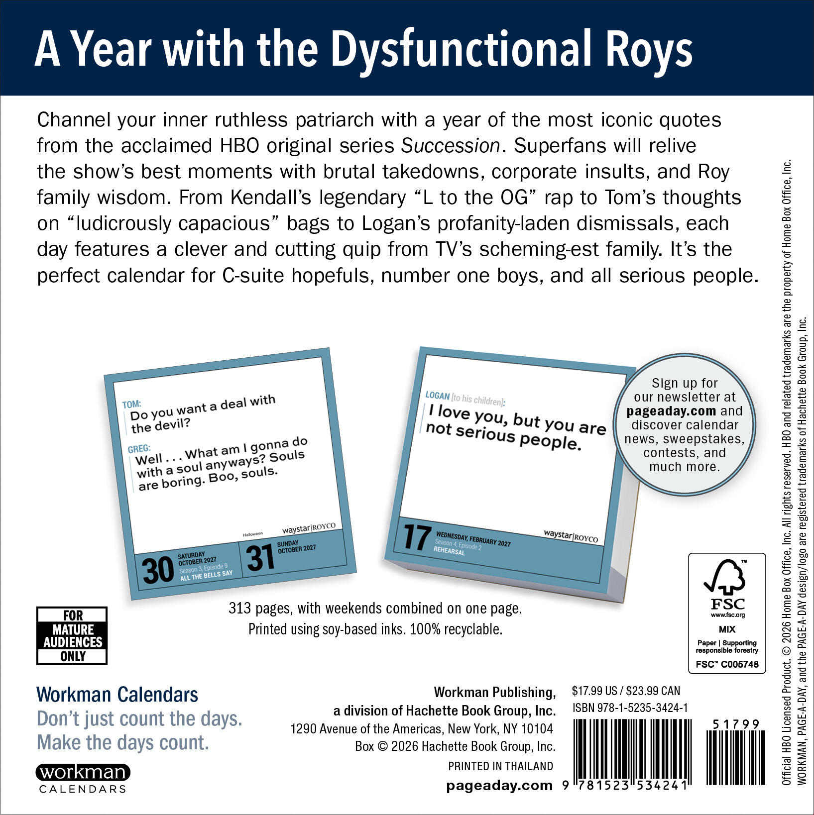 - FOR SERIOUS PEOPLE: This officially licensed calendar is perfect for anyone who can’t get enough of the Roy family’s antics. Here’s a year of Logan’s wisdom, Roman’s humor, Shiv’s wit, and Kendall’s business acumen, plus more quotes from all your favorite characters.