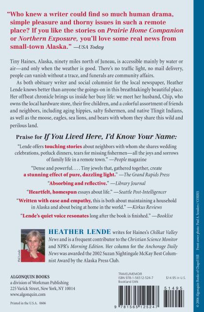“Part Annie Dillard, part Anne Lamott, essayist and NPR commentator Heather Lende introduces readers to life in the town of Haines, Alaska . . . subtly reminding readers to embrace each day, each opportunity, each life that touches our own and to note the beauty of it all.”