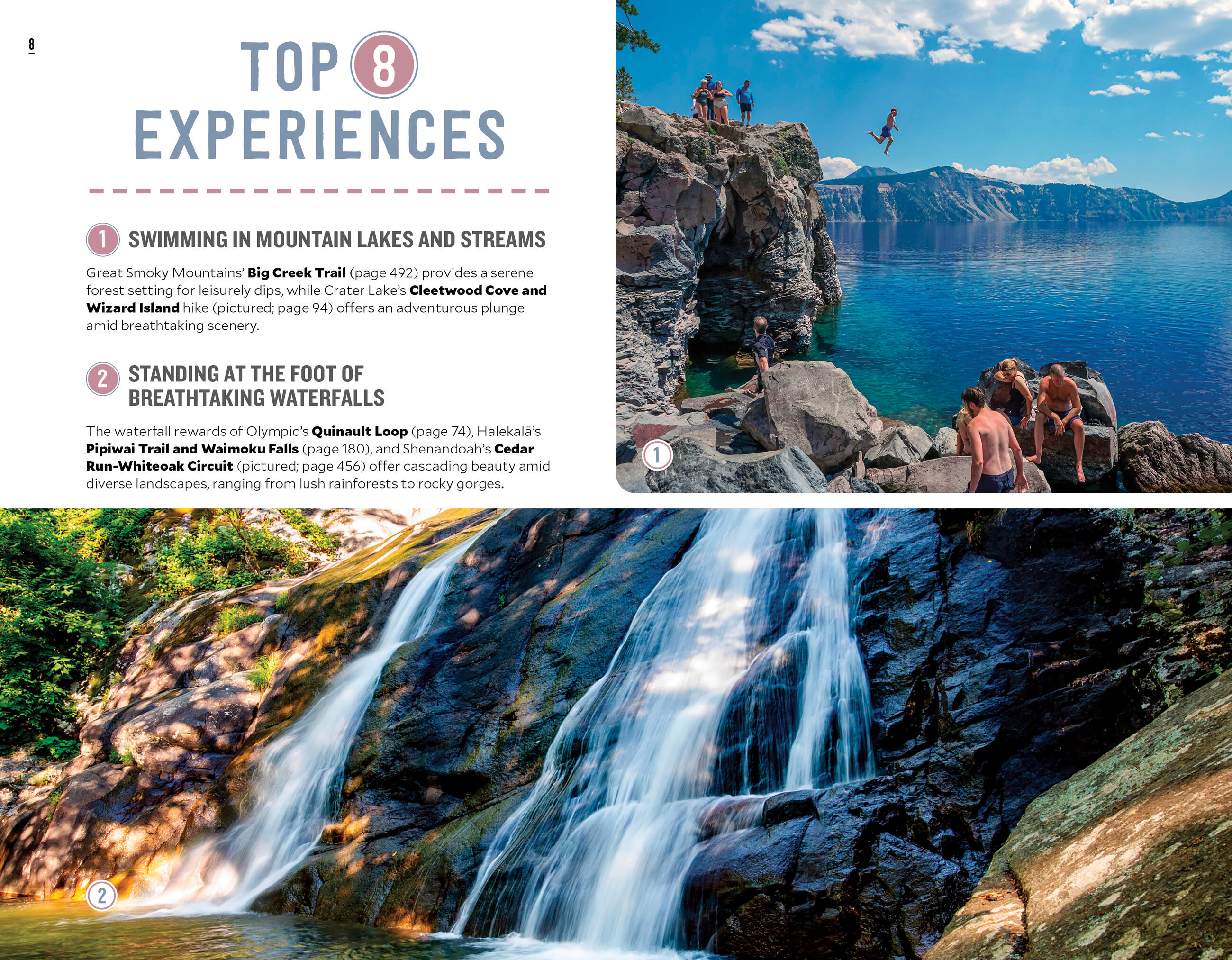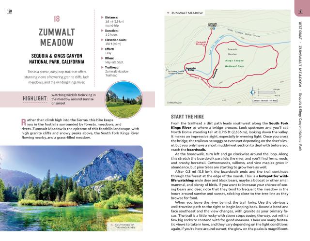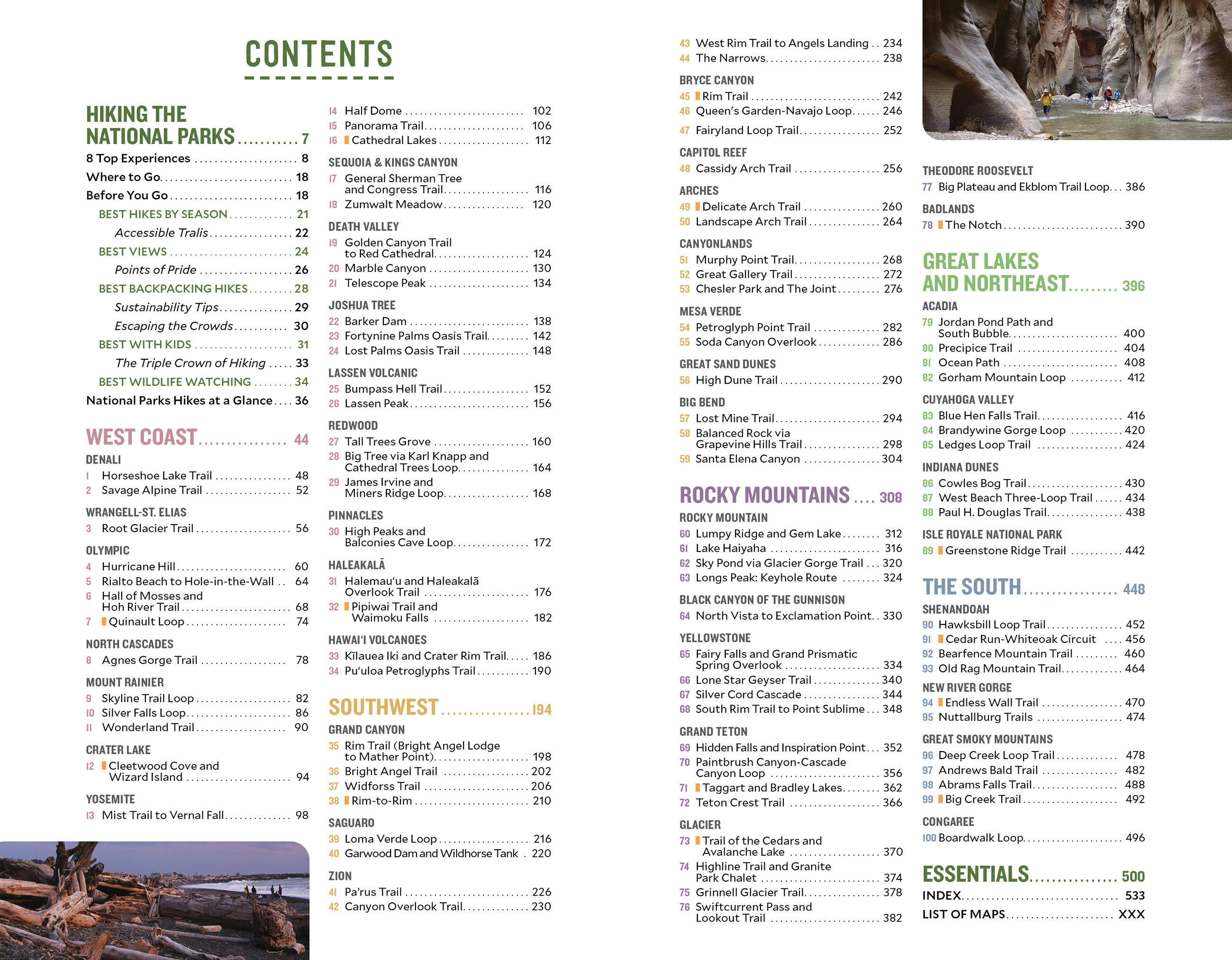 • Coverage of 100 hiking trails across 40 national parks, from Acadia to Zion, organized by region