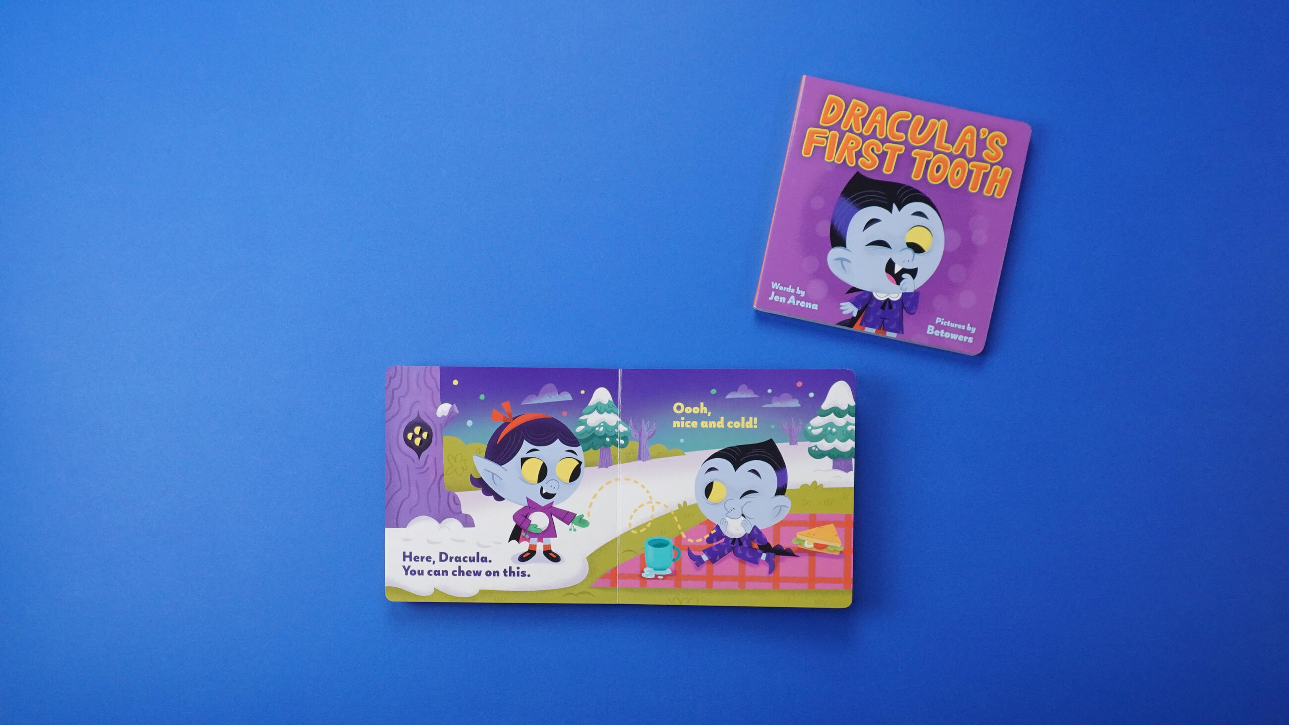 Dracula is ready for his first fang! In this board book, baby Dracula wakes up with a pain in his mouth. After trying numerous things to make the pain go away, Dracula and his parents discover his first tooth is coming in. Perfect for parents to share with young readers who are experiencing their own firsts, Dracula’s First Tooth presents an early childhood milestone through a classic literary monster.