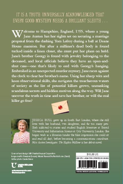 Jane Austen—sparkling, spirited, and incredibly clever—is suddenly thrust into a mystery when a milliner’s dead body is found locked inside a cupboard in the middle of a ball. When Jane’s brother Georgy is found with some jewelry belonging to the deceased, the local officials see it as an open-and-shut case: one which is likely to end with his death. Jane is certain that he is innocent, and there is more to the murder than meets the eye. Her investigations send her on a journey through local society, as Jane’s suspect list keeps on growing— and her keen observational skills of people will be put to the test to solve the crime and save her brother.