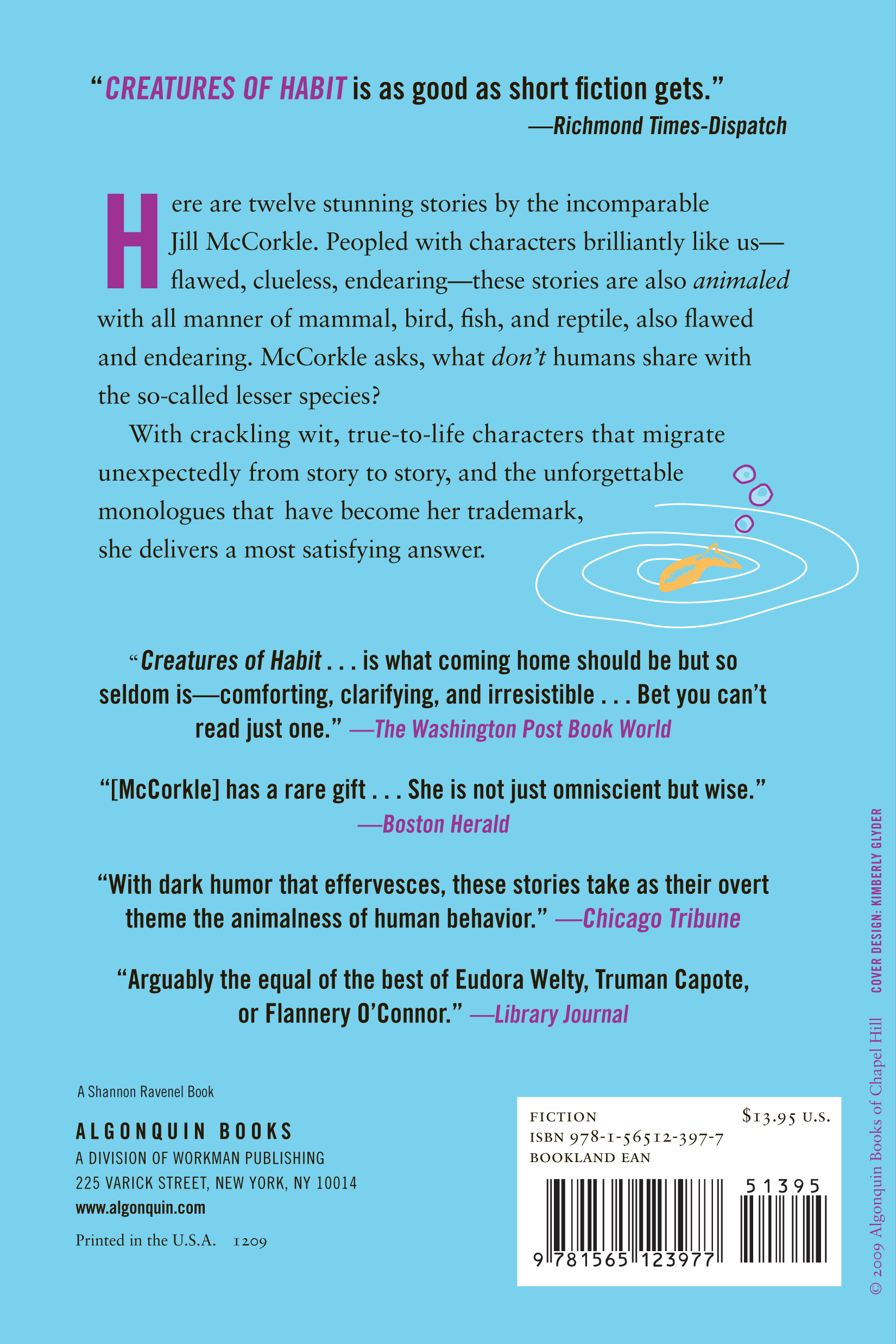 Jill McCorkle’s new collection of twelve short stories is peopled with characters brilliantly like us-flawed, clueless, endearing. These stories are also animaled with all manner of mammal, bird, fish, reptile-also flawed and endearing. She asks, what don’t humans share with the so-called lesser species? Looking for the answer, she takes us back to her fictional home town of Fulton, North Carolina, to meet a broad range of characters facing up to the double-edged sword life offers hominids. The insight with which McCorkle tells their stories crackles with wit, but also with a deeper-and more forgiving-wisdom than ever before. In Billy Goats, Fulton’s herd of seventh graders cruises the summer nights, peeking into parked cars, maddening the town madman. In Monkeys, a widow holds her husband’s beloved spider monkey close along with his deepest secrets. In Dogs, a single mother who works for a veterinarian compares him-unfavorably-with his patients. In Snakes, a seasoned wife sees what might have been a snake in the grass and decides to step over it. And, in the exquisite final story, Fish, a grieving daughter remembers her father’s empathy for the ugliest of all fishes. The success behind Jill McCorkle’s short stories-and her novels-is, as one reviewer noted, her skill as an archaeologist of the absurd, an expert at excavating and examining the comedy of daily life (Richmond Times-Dispatch). Yes, and also the tragedy.