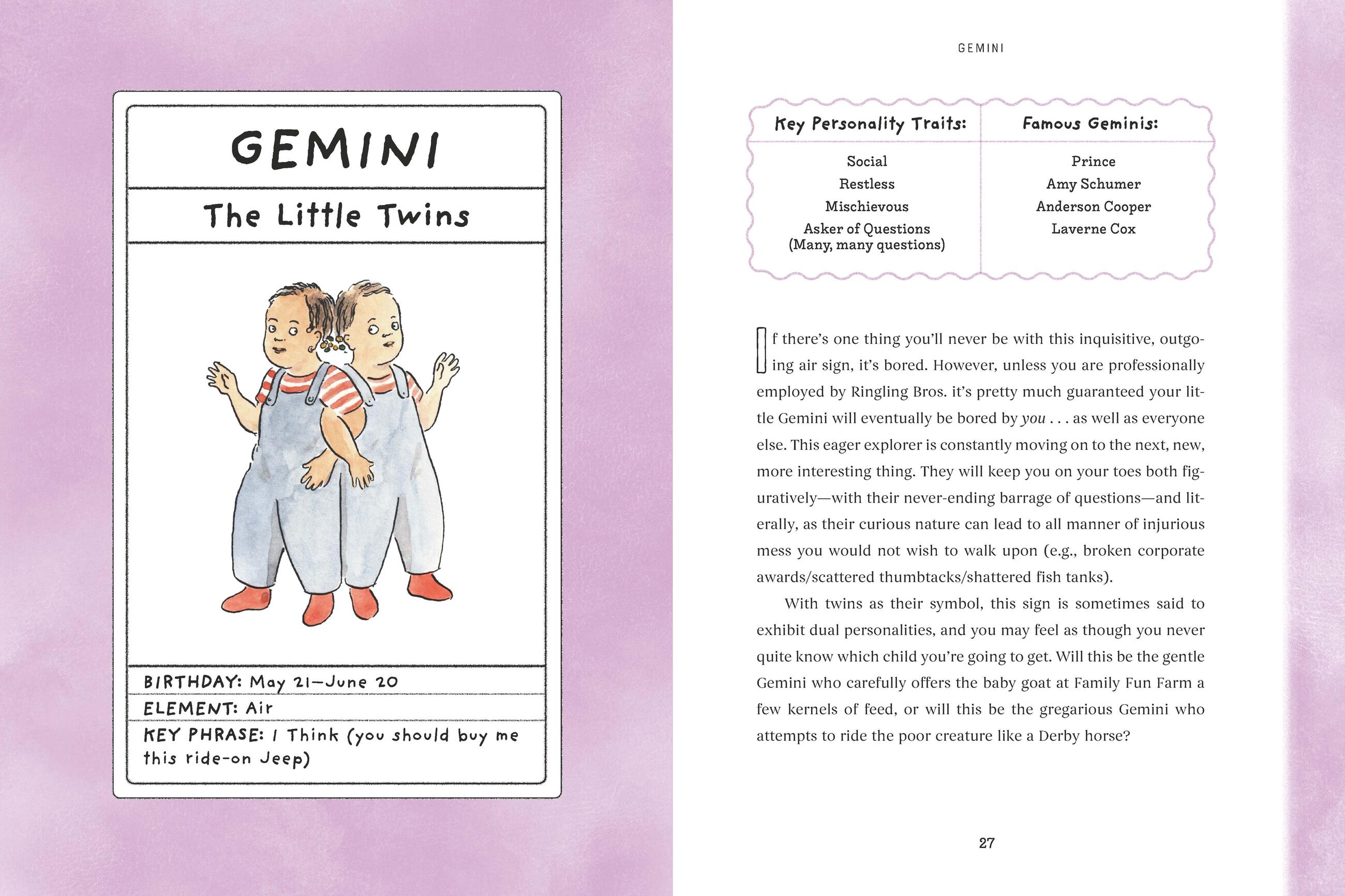 Blending parental exasperation with cosmic insight, Gohmann breaks down toddler personalities by zodiac sign—offering a starry-eyed (and slightly frazzled) look at the joys and mysteries of raising tiny humans. The profiles of each zodiac sign include sections dedicated to best (and worst!) toddler playdate matches; toddler’s preferred music, snacks, and toys; parent-child zodiac compatibility; and hilarious illustrations throughout from cartoonist Emily Flake. Whether you are raising a tenacious Taurus, a balanced Libra, or, yes, a hell-raising Scorpio, this is a book that lets parents laugh at the sheer insanity of sharing their home with a tiny terror.