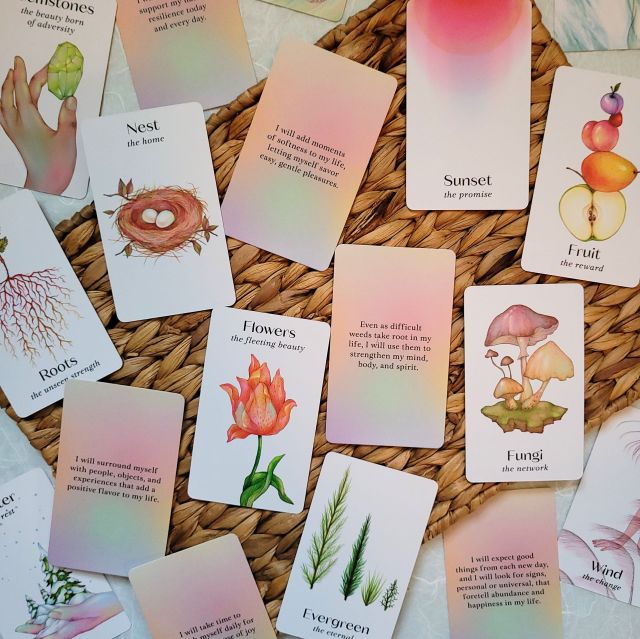 - 52-card deck with beautiful illustrations: Each card focuses on one element of nature, with its powerful meaning on the front and the Intention for how it connects to your well-being and body on the back; each card highlights the detail and exquisite beauty of nature with stunning full-color illustration by internationally published artist Vicki Ling