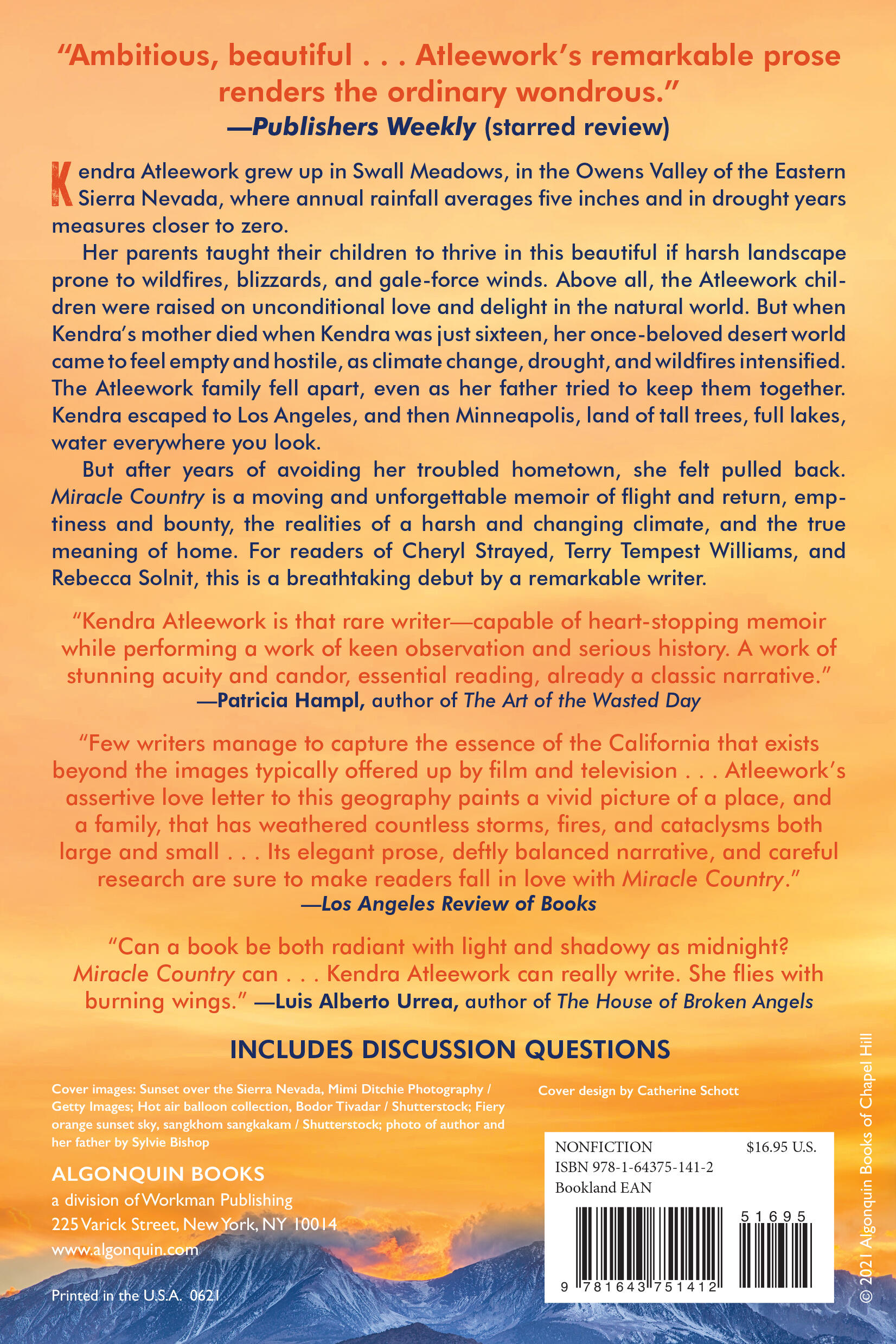 “Atleework captures how the history of the landscape affects how people feel in the present in prose charged with emotion . . . Miracle Country is a beautiful read, Atleework’s prose steeped in her passion for the region and her striking observations. Even more, though, the memoir is important because it reveals Atleework’s deep understanding of the region, of a life defined by an absence, and she points us to the power in this understanding—it can be a tool to stay safe in a desert or on a cliff, a way to connect with other people, a call to counteract climate change, or, as in Atleework’s case, a reason to return home.”