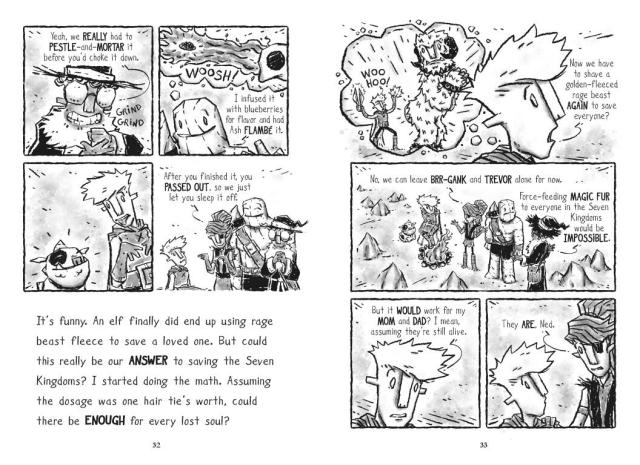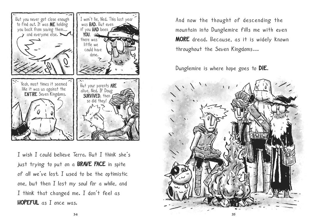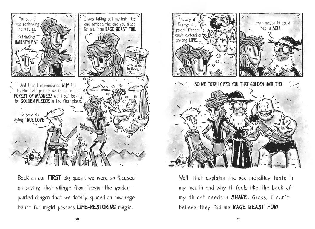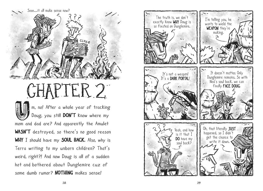 In the wake of the narrow escape from the evil Doug (an ex-bard determined to bum out and rule the world), the Quest Kids’ leader, Ned, was turned into a Doug-loving zombie by Doug’s powerful soul-stealing gem. The rest of the Quest Kids—Terra, Boulder, Gil, and Ash—have spent a year wandering the Seven Kingdoms, going from town to town trying to warn the people of Doug’s impending invasion. But always too late! By the time they revive Ned, all but one kingdom—the Goblin citadel of Dunglemire—has been transformed into mindless Doug fans. Arriving at Dunglemire, the Quest Kids find a huge encampment of Doug followers, ready for the biggest soul-stealing event of all time: Dougfest! The Quest Kids must work fast to pierce the impassable walls of Dunglemire, make common cause with the mysterious, and reputedly hideous, Goblins, and solve the mystery of an ancient spell that can neutralize Doug and free the world. Using their wits, magic, and questing knowledge (as well as the help of a flame-farting dog-lizard thing), can the Quest Kids stop this world conquerer? And can they reunite Ned and his long-lost parents?