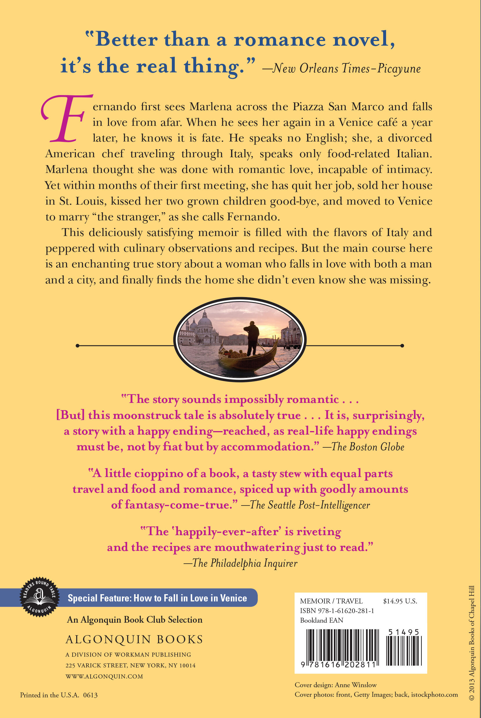 Fernando first sees Marlena across the Piazza San Marco and falls in love from afar. When he sees her again in a Venice café a year later, he knows it is fate. He knows little English; she, a divorced American chef traveling through Italy, speaks only food-based Italian. Marlena thought she was done with romantic love, incapable of intimacy. Yet within months of their first meeting, she has quit her job, sold her house in St. Louis, kissed her two grown sons good-bye, and moved to Venice to marry “the stranger,” as she calls Fernando.