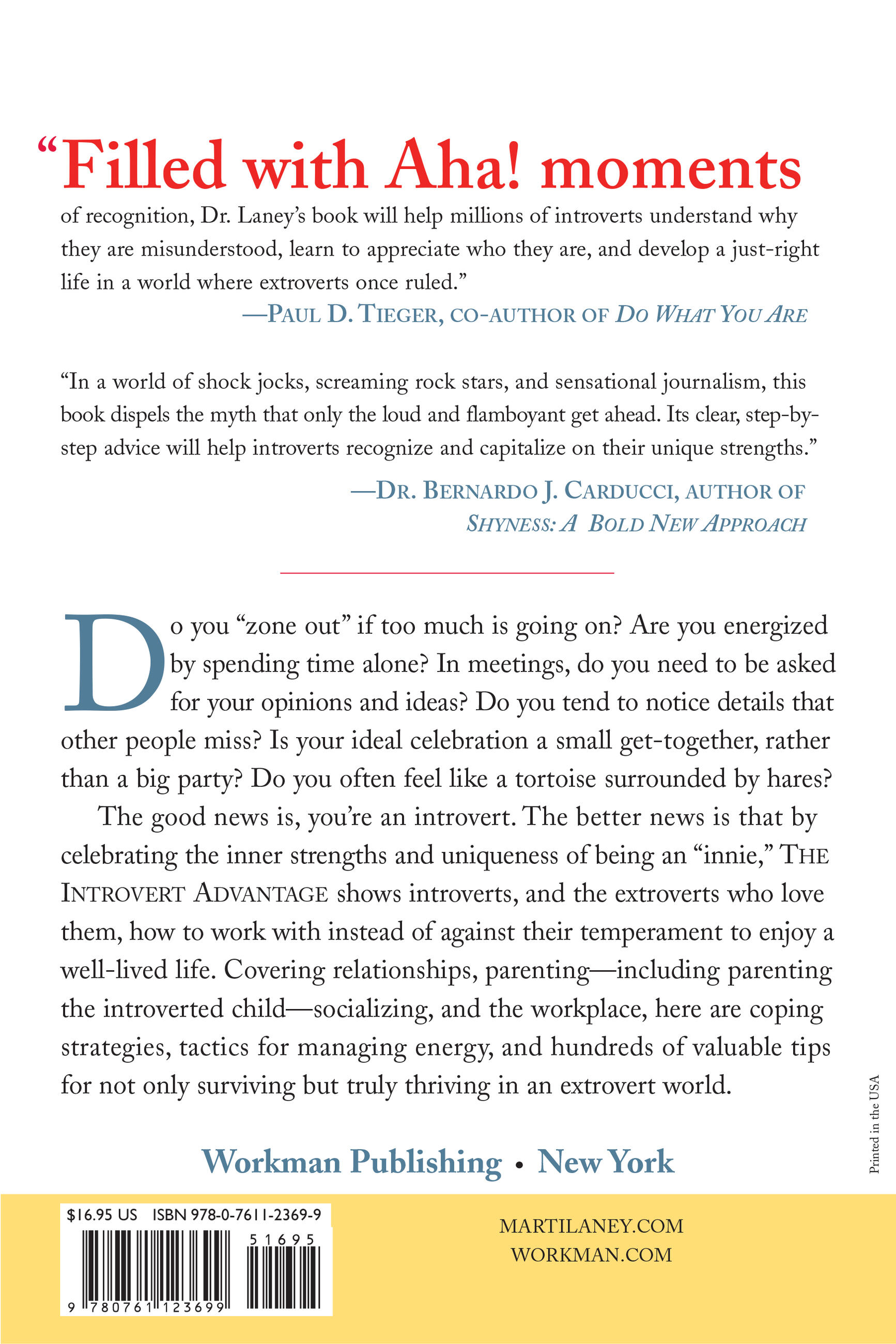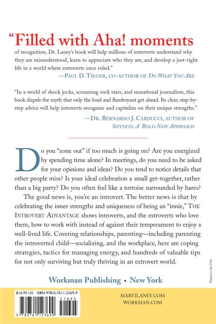 “Filled with Aha! moments of recognition, Dr. Laney’s book will help millions of introverts understand why they are misunderstood, learn to appreciate who they are, and develop a just-right life in a world where extroverts once ruled.” —Paul D. Tieger, coauthor of Do What You Are