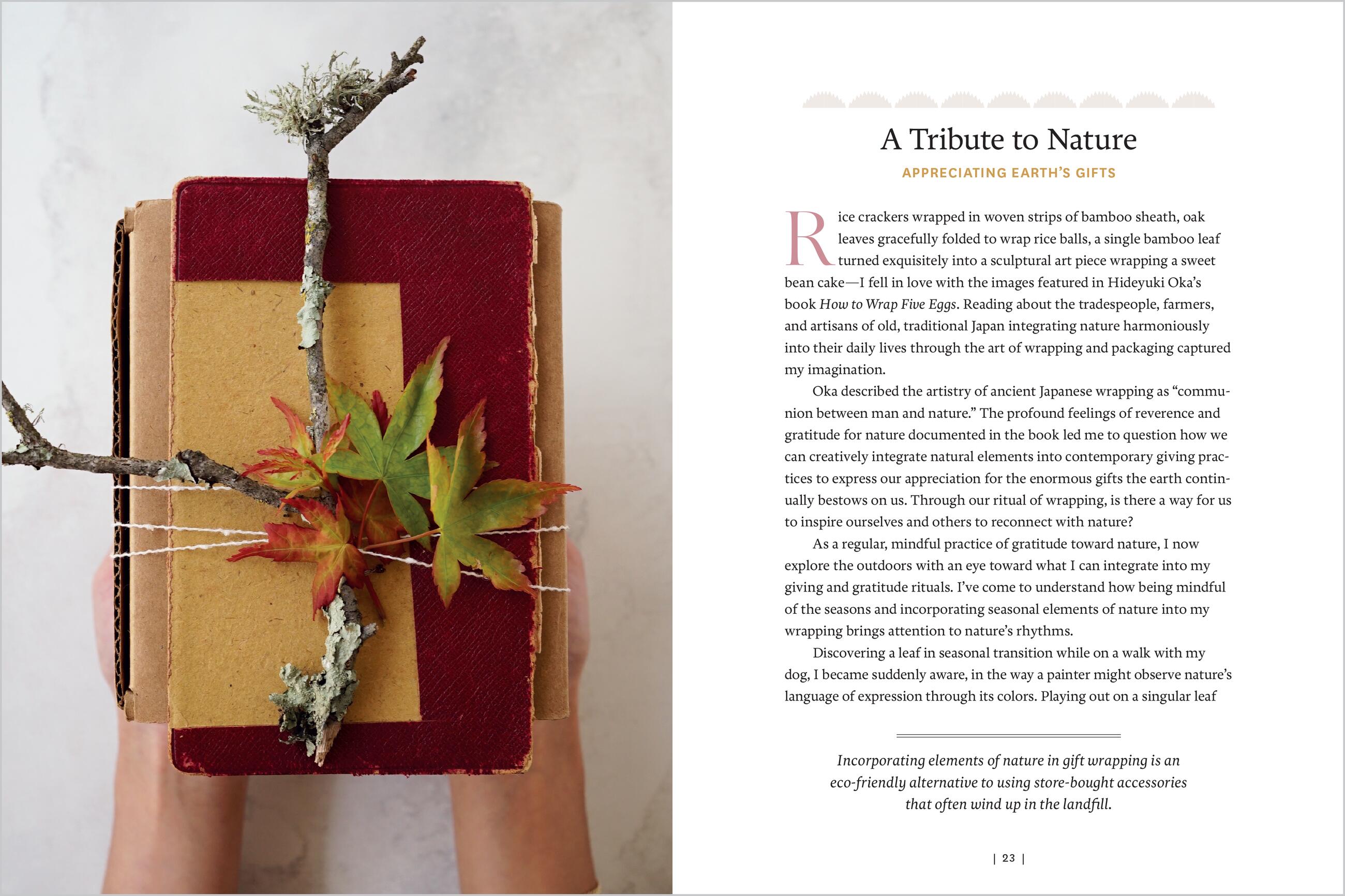 “Megumi’s book is not just about gift-wrapping. She takes us on a journey that includes learning about materials and techniques while explaining how gratifying the thoughtful enclosure of a gift can be—to both the giver and receiver. She skillfully shares her life experiences and explains the traditional Japanese art of gift wrapping as an important way of showing gratitude. Her thoughtful choices of paper, fabric, found embellishments, and plants are innovative and demonstrate elegant simplicity. Megumi encourages repurposing, discovery, and our unique artistic expression in how we choose to enclose our gifts to each other. After reading her book, you will look at wrapping gifts in a whole new, meaningful way.”Aiko Cuneo, artist and educator
