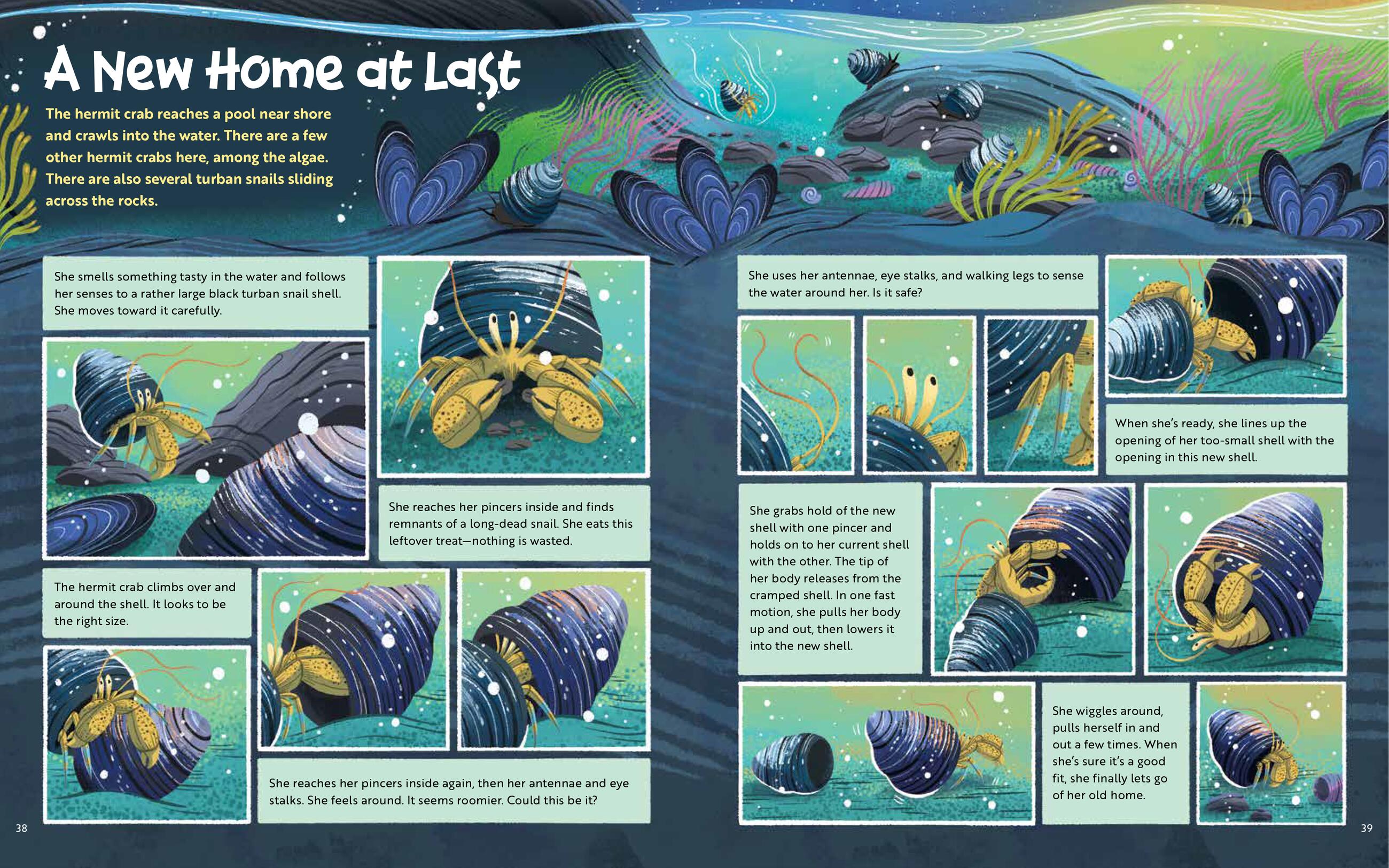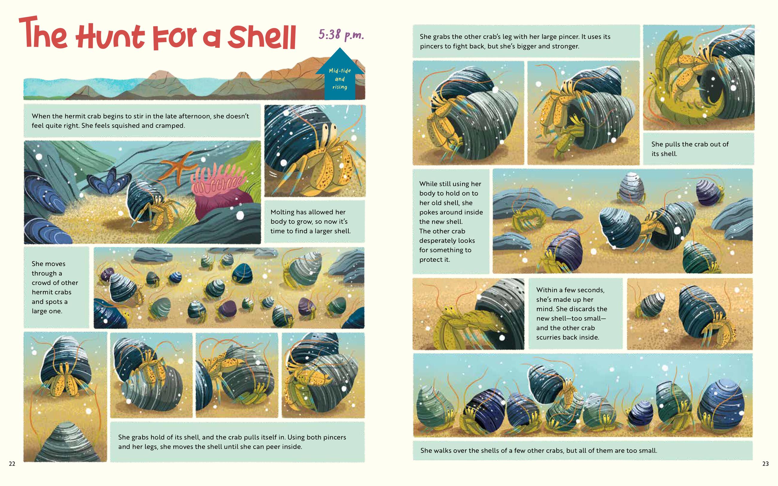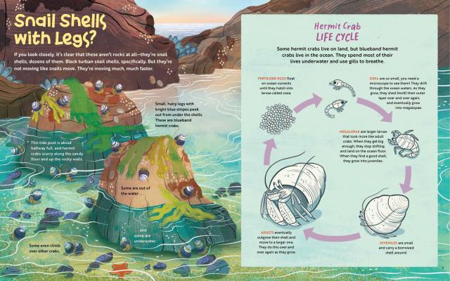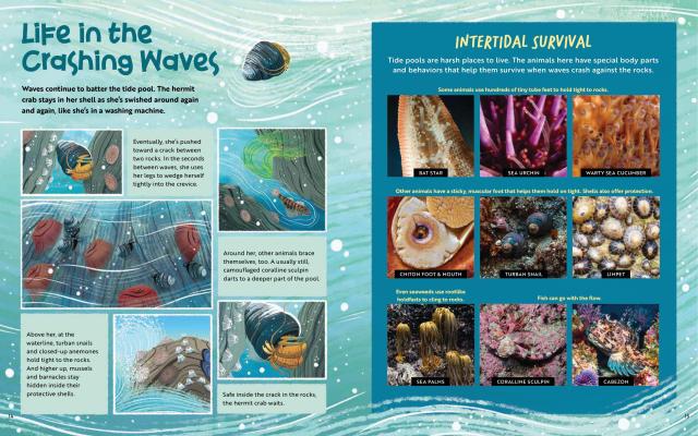 In a great tide pool along the central coast of California, what from afar looks like just a rocky outcropping comes to life with color and drama as a hermit crab searches for a new, larger shell. The crab must survive extreme conditions through the course of a tide cycle–encountering crashing waves, hungry predators, and a neighborhood of diverse animals–in order to find her new home. While following the crab’s story through gorgeous, paneled illustrations, readers will also learn about the adaptations of a wide variety of creatures, why tides happen, the tide pool food web, and more through sidebars and photos.