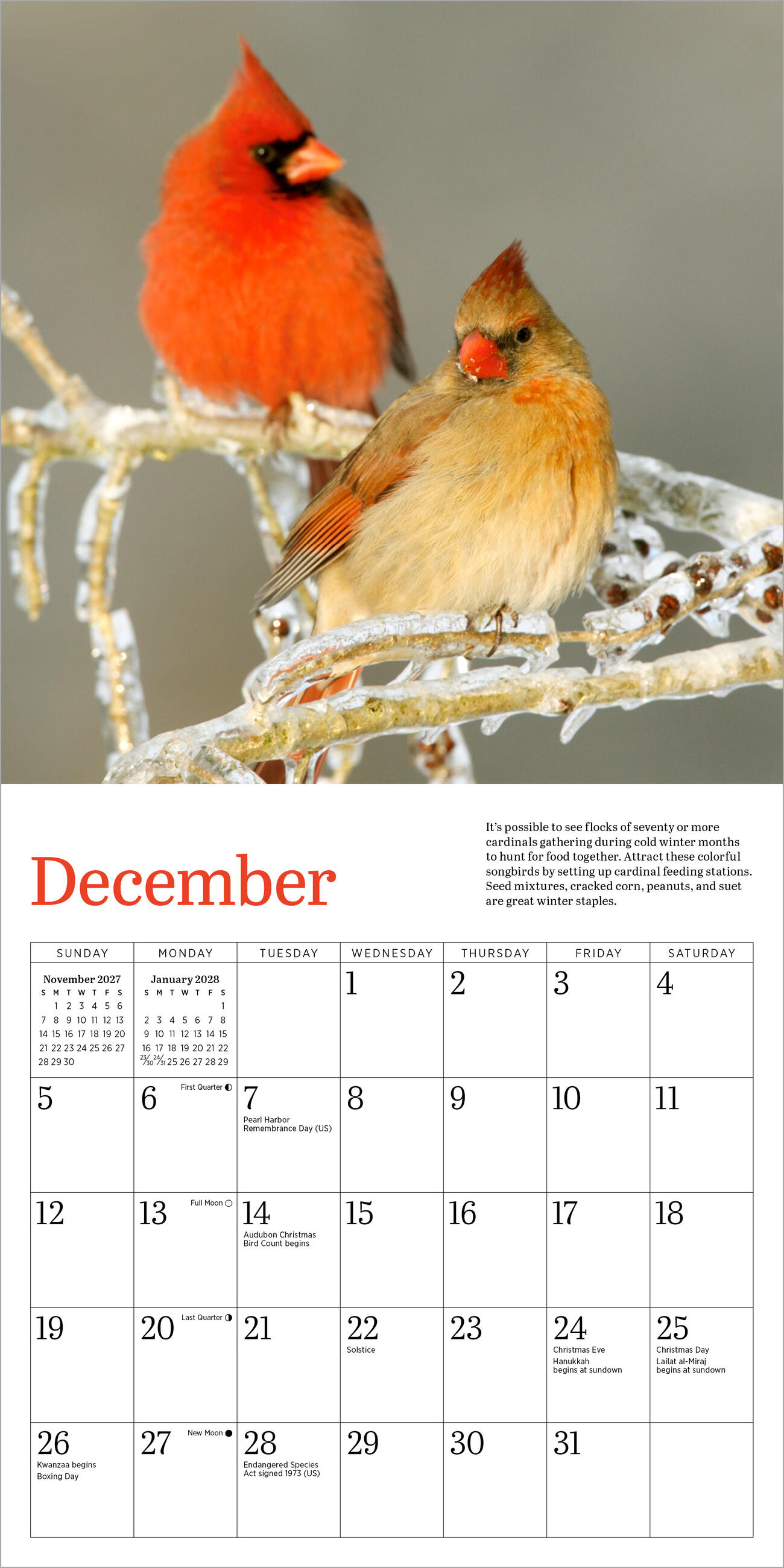 - VIBRANT AND LIVELY: Stunning monthly photographs capture cardinals’ iconic bright red plumage. Each image is accompanied by fun facts, including how to attract them to your yard or feeder.