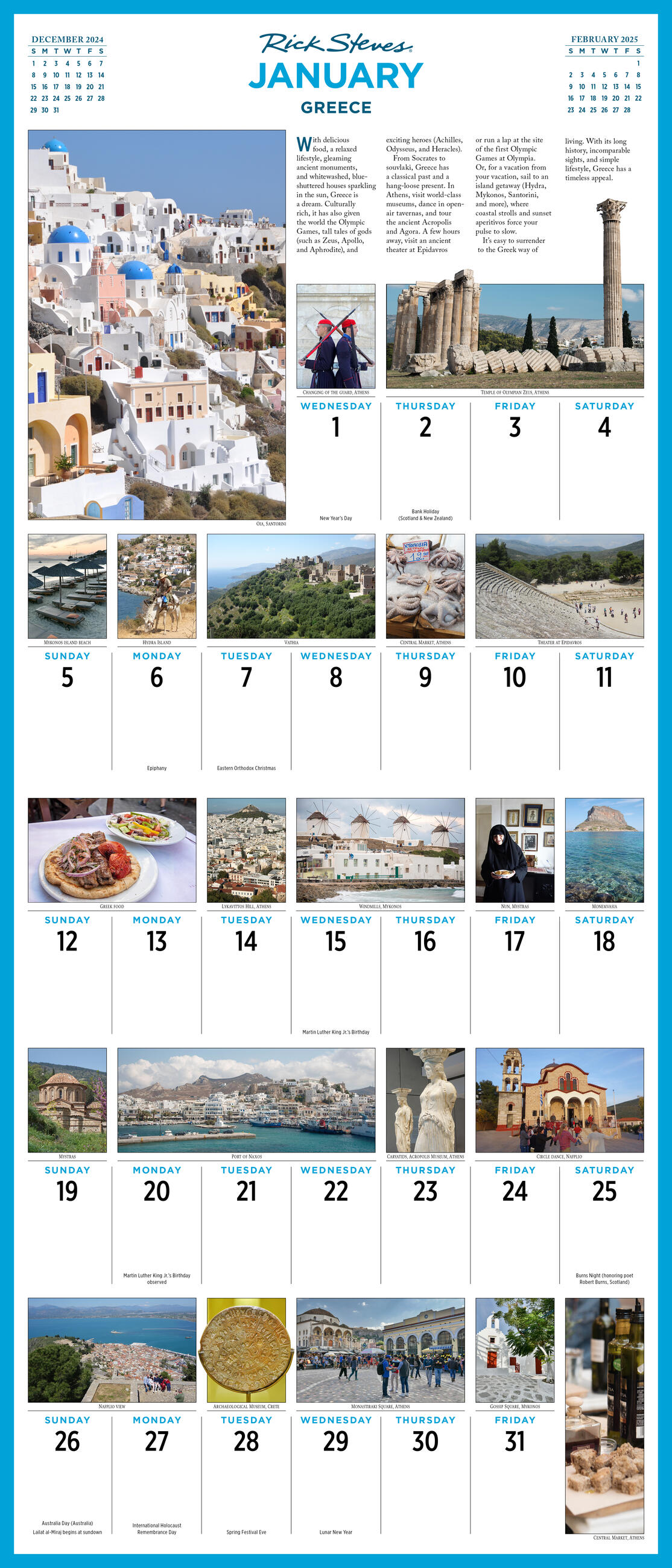 • GREAT GIFT: Ideal for anyone who wishes they could spend all year traveling, this is the ultimate calendar for Europe aficionados. Each month features a bucket-list destination with a map, itinerary, highlights, and over 20 photos throughout the grid.