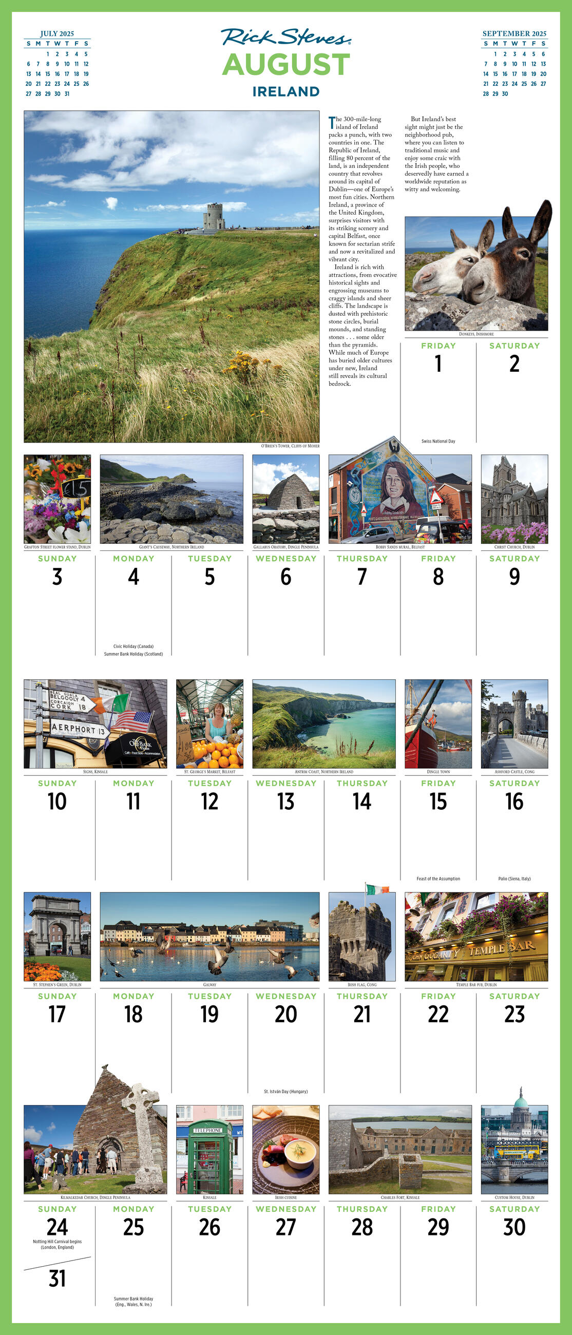 • MUST-SEE SIGHTS: Spend a year abroad across Europe, including Greece, Germany, Scotland, Iceland, and more iconic destinations. Each month features a different country with information and photos for nearly every day.