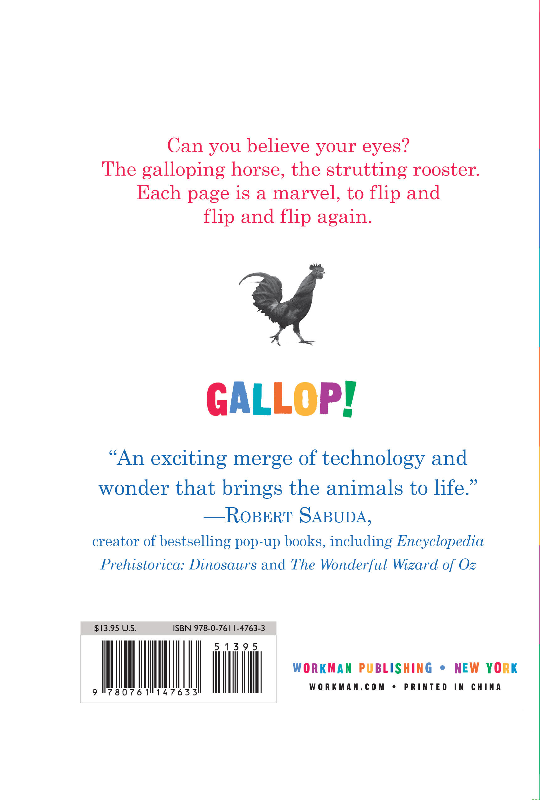 There’s never before been a book like Gallop! Employing a patented new technology called Scanimation, each page is a marvel that brings animals, along with one shining star, to life with art that literally moves. It’s impossible not to flip the page, and flip it again, and again, and again.