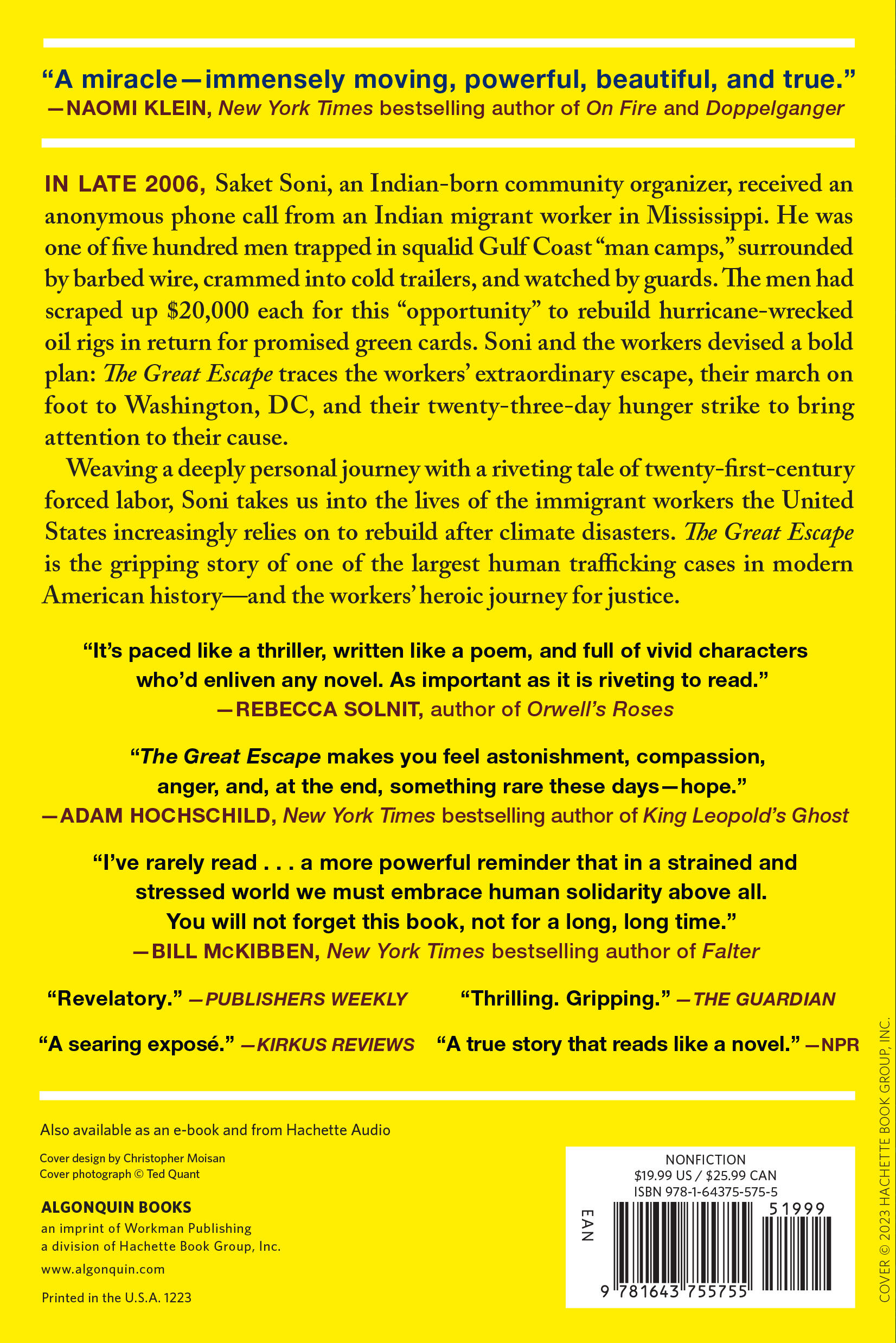 Weaving a deeply personal journey with a riveting tale of twenty-first-century forced labor, Soni takes us into the lives of the immigrant workers the United States increasingly relies on to rebuild after climate disasters. The Great Escape is the gripping story of one of the largest human trafficking cases in modern American history—and the workers’ heroic journey for justice.