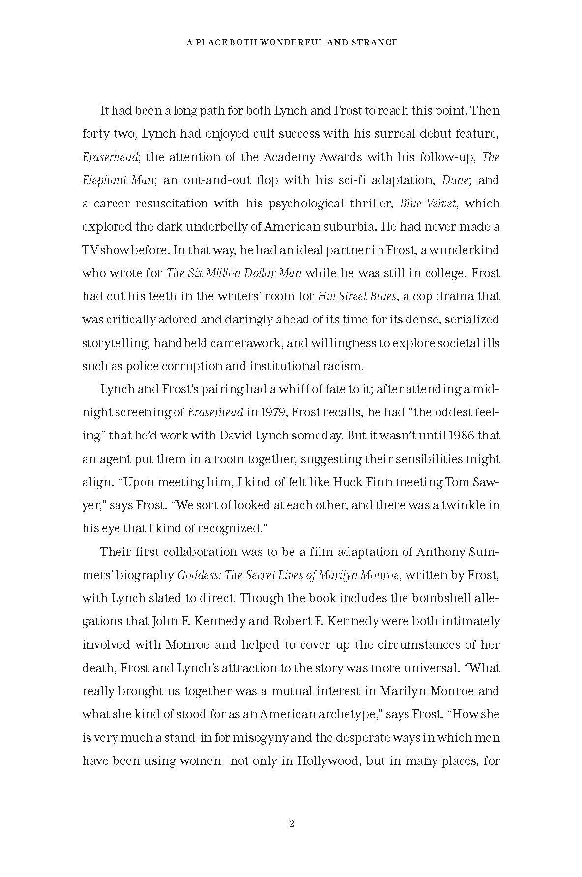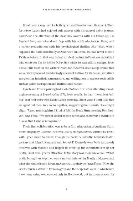 “Scott Meslow’s dishy, insightful account of the making of Twin Peaks applies a sharp lens to the surreal blockbuster that rocked the television medium in the early 1990s, along with the two wild sequels that followed in its wake. Smartly reported and full of thoughtful analyses of the complex collaboration behind the franchise, as well as the show’s many highs, lows and ‘happy accidents,’ A Place Both Wonderful and Strange is the perfect book for anyone eager to unlock the mysteries of The Black Lodge and the people who built it.”Emily Nussbaum, Pulitzer Prize-winning television critic and staff writer for The New Yorker