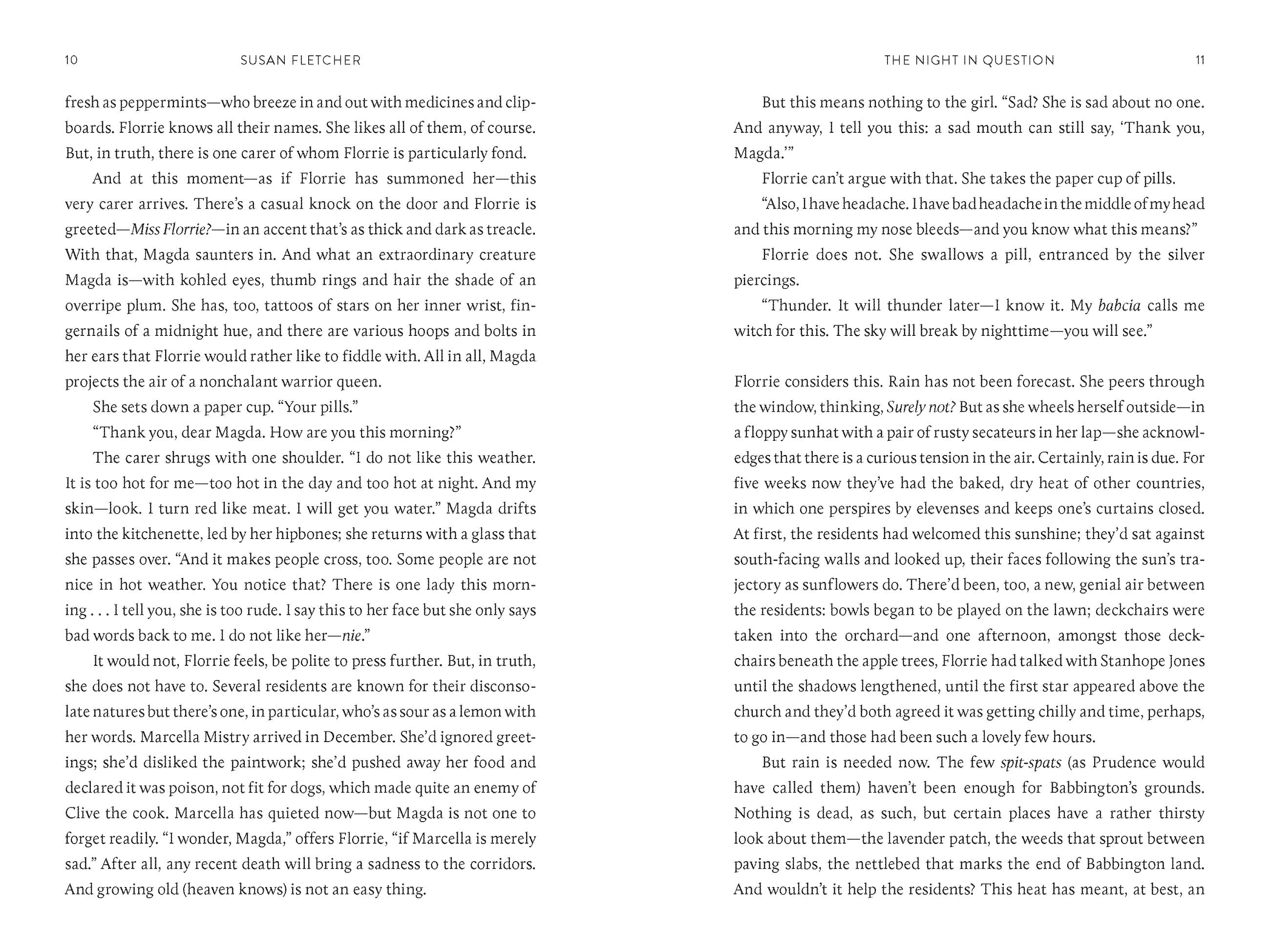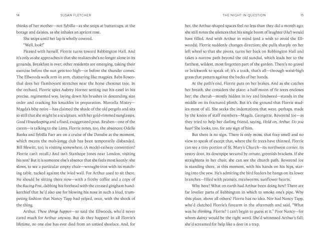 Florrie Butterfield—eighty-seven, one-legged, and of cheerful disposition—believes there can’t be any more adventures or surprises in life to experience. Yet one midsummer’s evening, there’s an accident at Babbington Hall—the adult residence where she lives—so shocking and strange that Florrie is suspicious; is this really an accident? Or is she being lied to? Is she, in fact, living alongside a potential murderer? In her efforts to learn the truth, Florrie is forced to look back on her own life, with all its passions and regrets; she must confront her own bloody secret—and, at last, forgive herself. Above all, Florrie learns, through the help of her new friend, Stanhope, that you’re never too old to have the life you’ve always dreamed of. When it comes to love, it’s never too late.