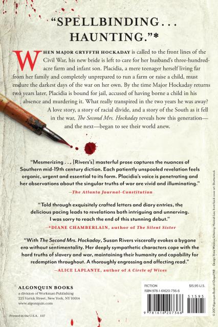 When Major Gryffth Hockaday is called to the front lines of the Civil War, his new bride is left to care for her husband’s three-hundred-acre farm and infant son. Placidia, a mere teenager herself living far from her family and completely unprepared to run a farm or raise a child, must endure the darkest days of the war on her own. By the time Major Hockaday returns two years later, Placidia is bound for jail, accused of having borne a child in his absence and murdering it. What really transpired in the two years he was away?