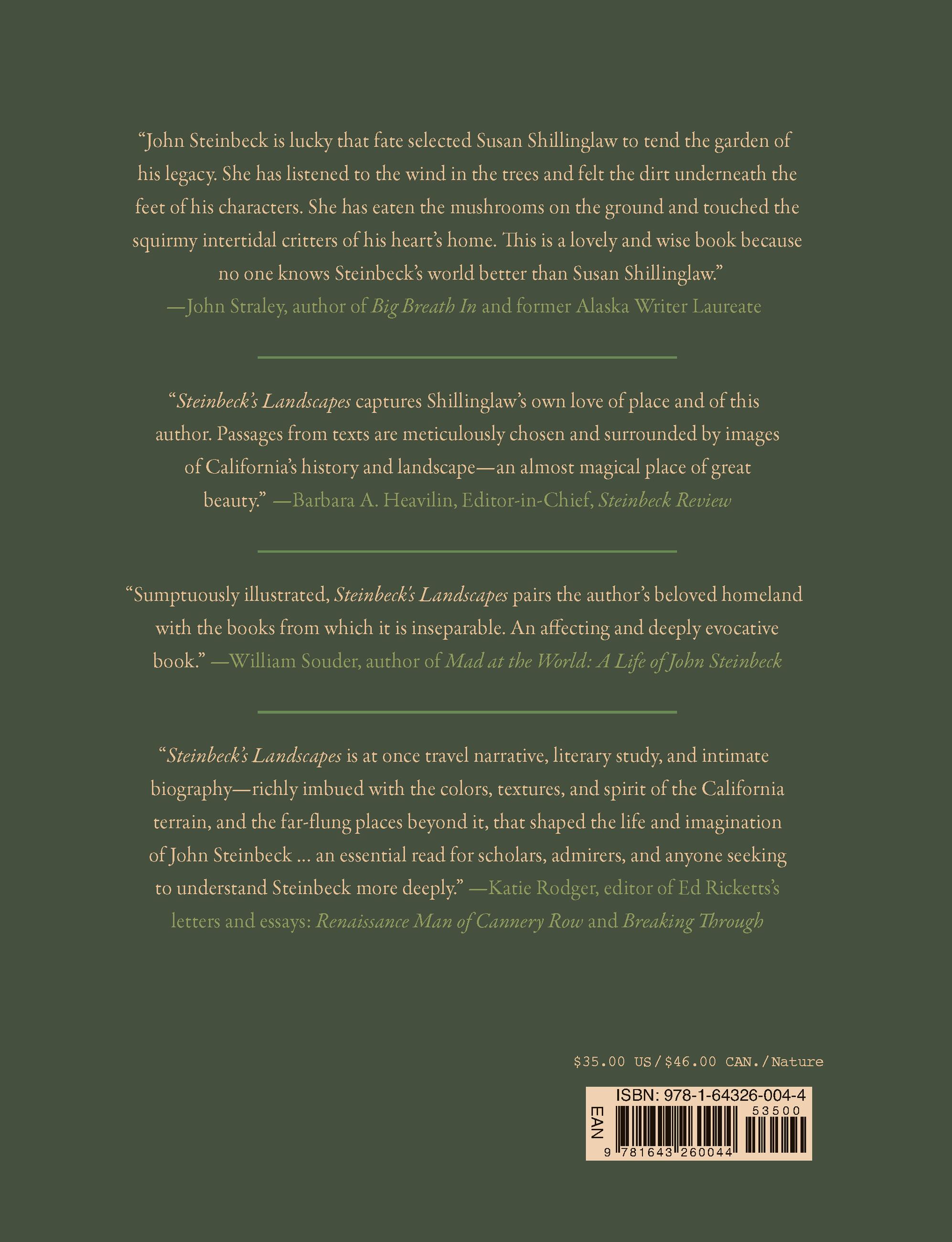 “John Steinbeck is lucky that fate selected Susan Shillinglaw to tend the garden of his legacy. She has listened to the wind in the trees, and felt the dirt underneath the feet of his characters. She has eaten the mushrooms on the ground and touched the squirmy intertidal critters of his heart’s home. This is a lovely and wise book because no one knows Steinbeck’s world better than Susan Shillinglaw.”John Straley, author of Big Breath In and former Alaska Writer Laureate