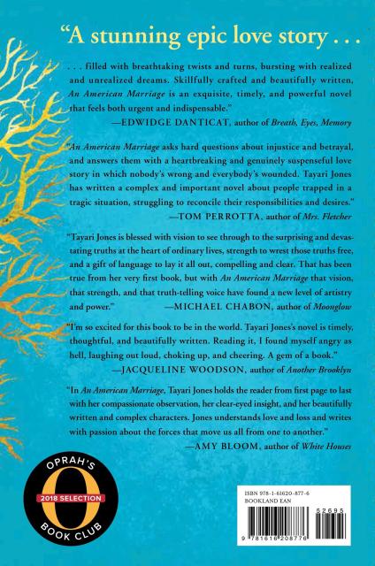 “An American Marriage asks hard questions about injustice and betrayal, and answers them with a heartbreaking and genuinely suspenseful love story in which nobody's wrong and everybody's wounded. Tayari Jones has written a complex and important novel about people trapped in a tragic situation, struggling to reconcile their responsibilities and desires.”