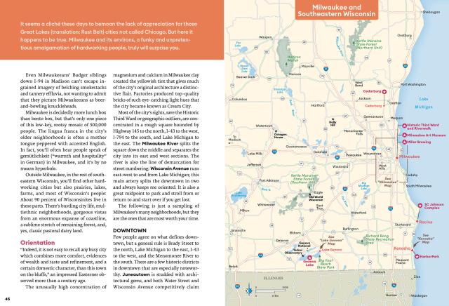 • Strategic itineraries, from a weekend in Milwaukee or Madison to a 10-day trip exploring the best of the state, with advice for architecture buffs, foodies, families, outdoor adventurers, and more