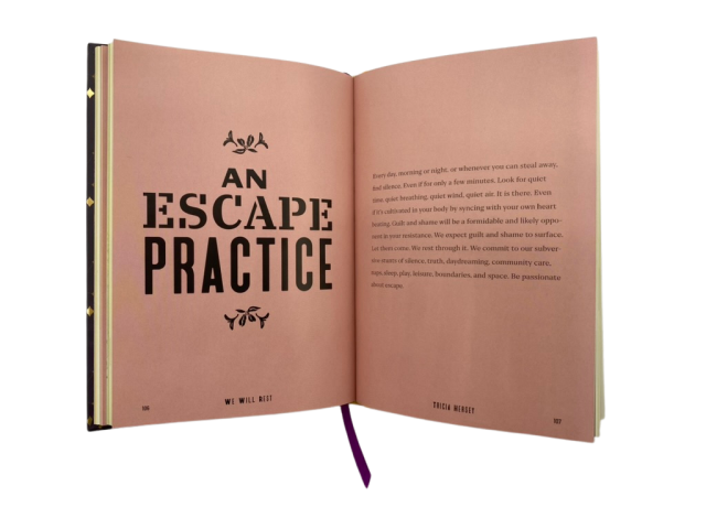 We Will Rest! is a modern sacred object, medicine for a sick and exhausted world. Weaving together meditations and poetry with storytelling and art, Hersey provokes liberation through refusal and trickster rebellion in the face of capitalism and white supremacy.